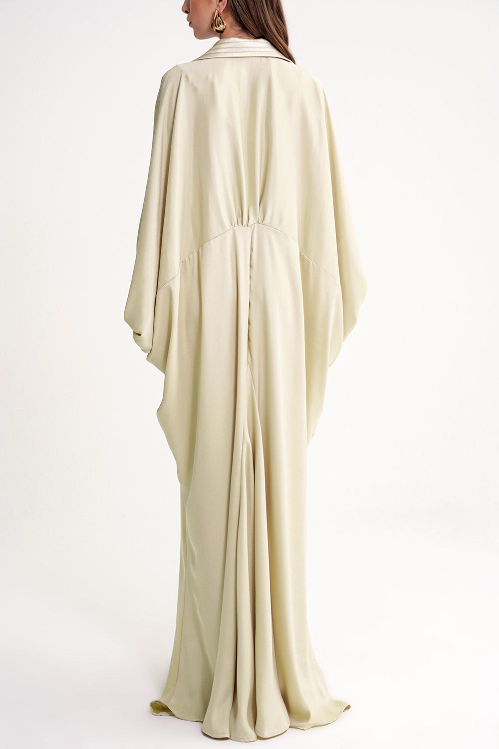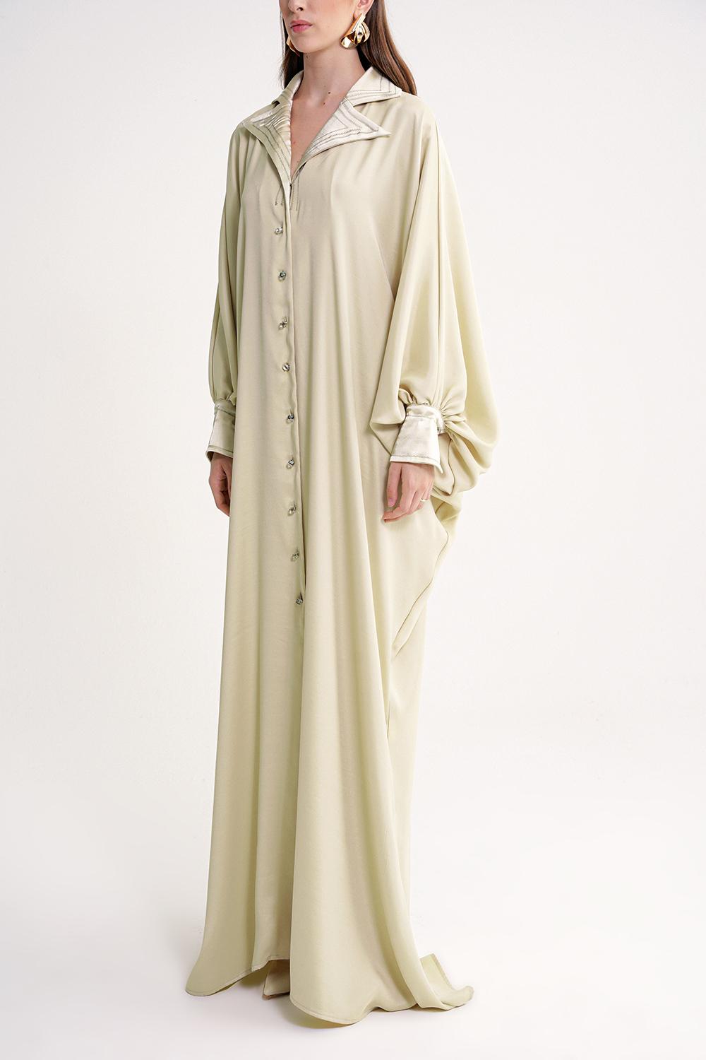 Beige Loose-cut long dress with stitching and crystal button detail 94614