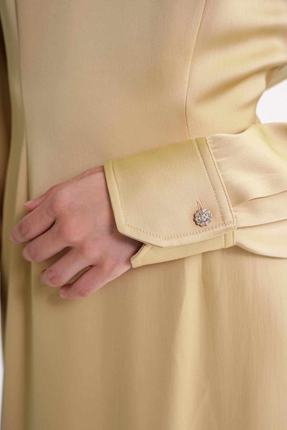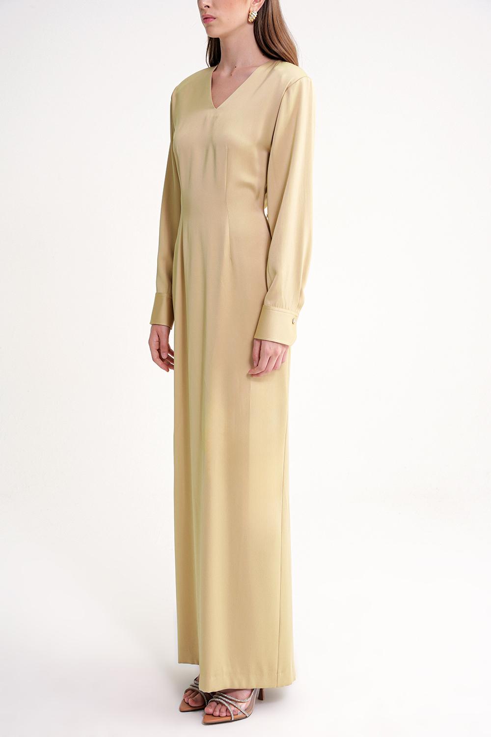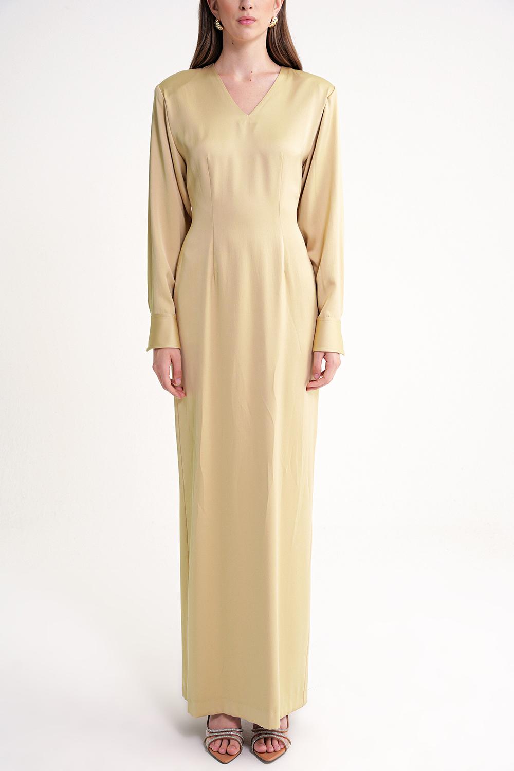 Beige Padded shoulder dress featuring an elegant gathered back 94430