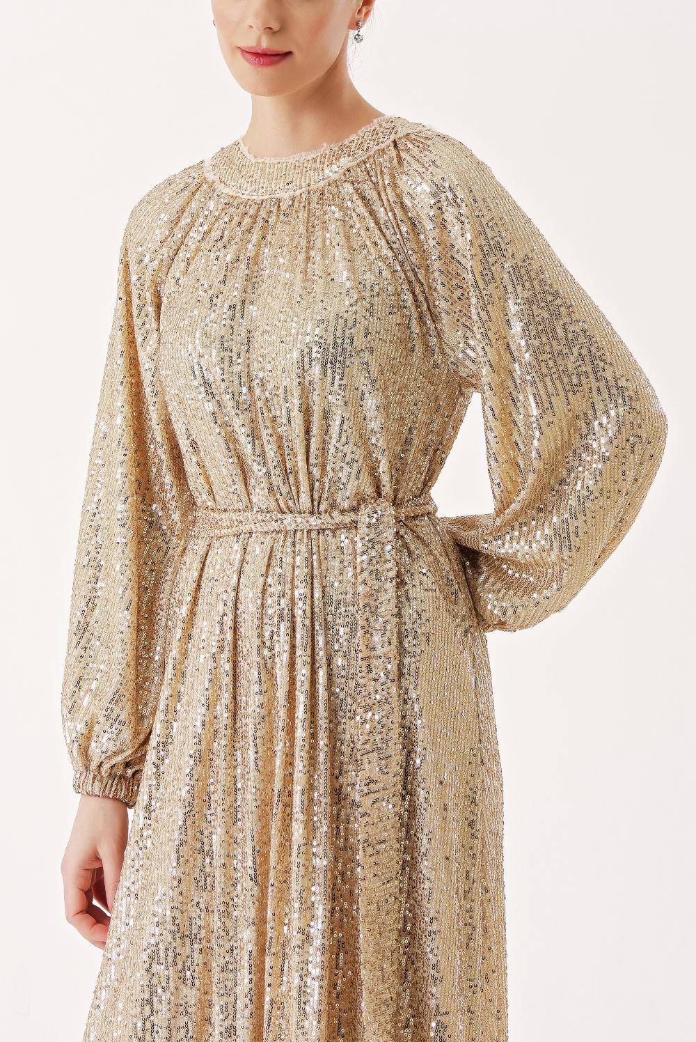 Beige Ruched detail sequined balloon sleeve dress 94468
