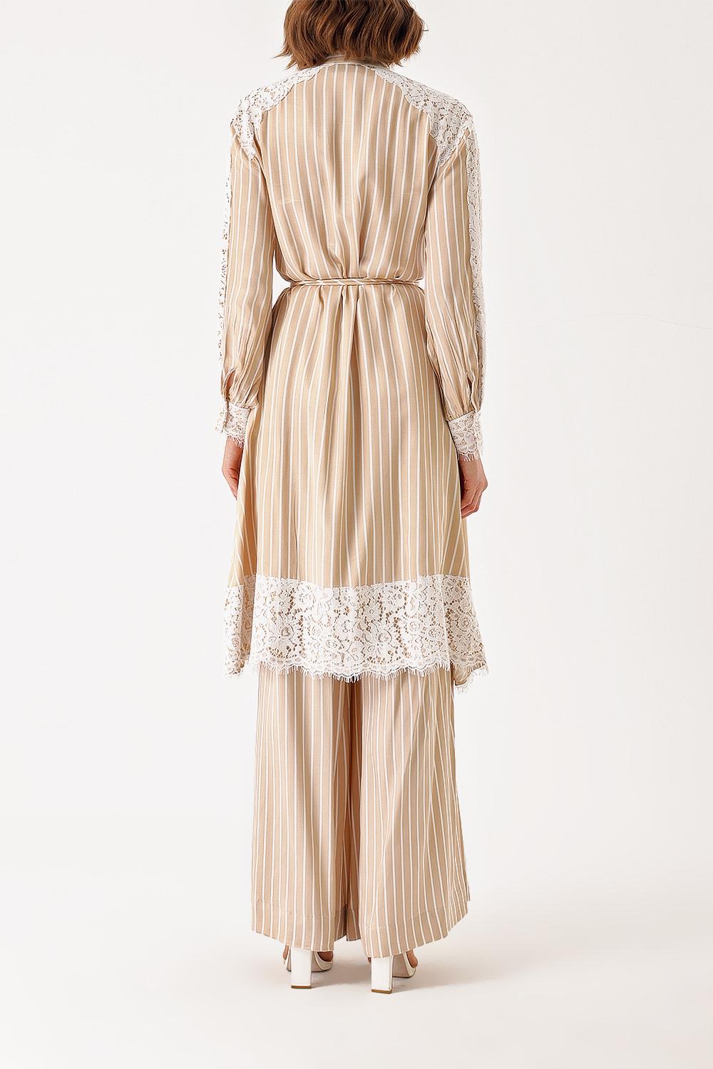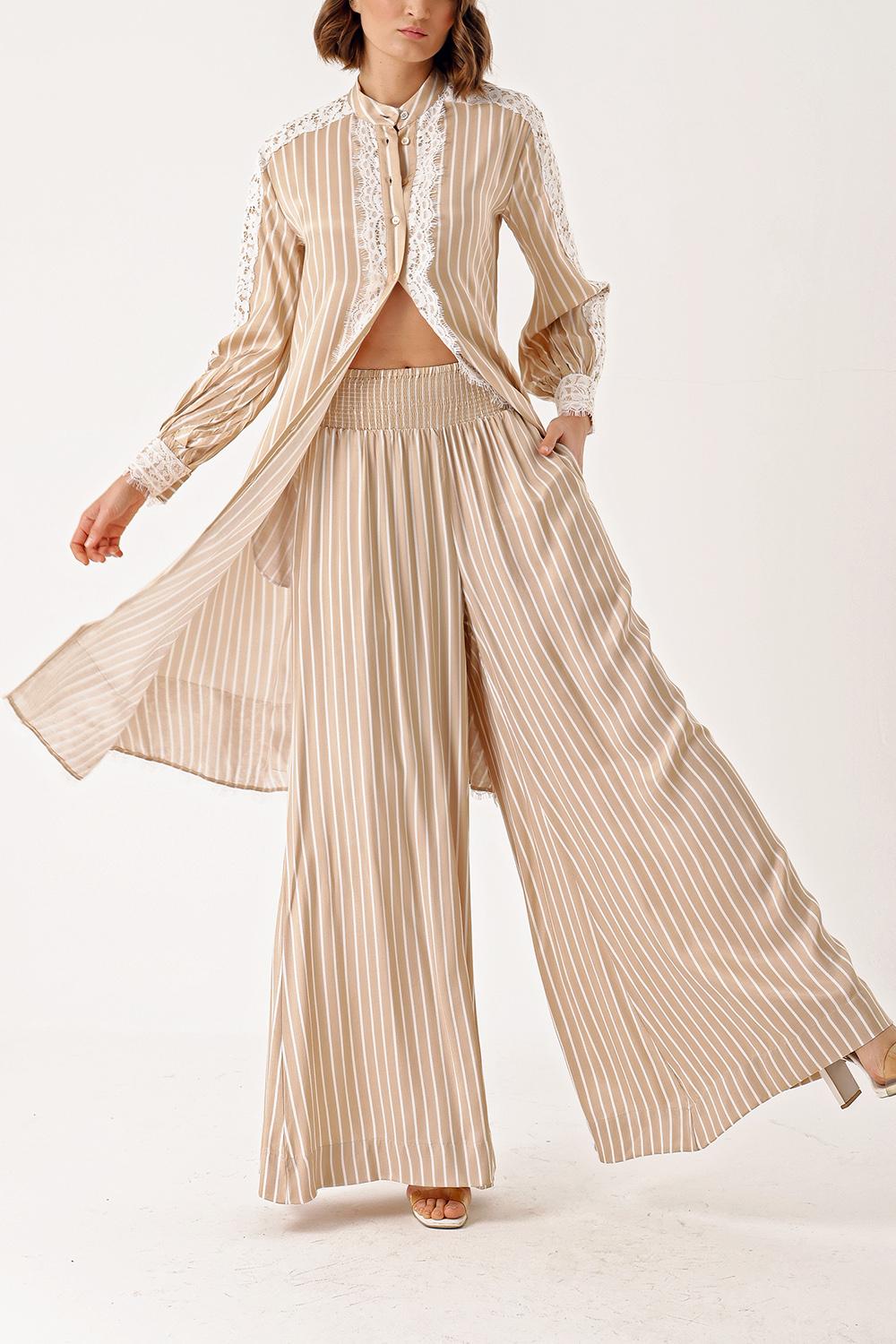 Beige Two-piece suit with lace detailed shirt and trousers 12321