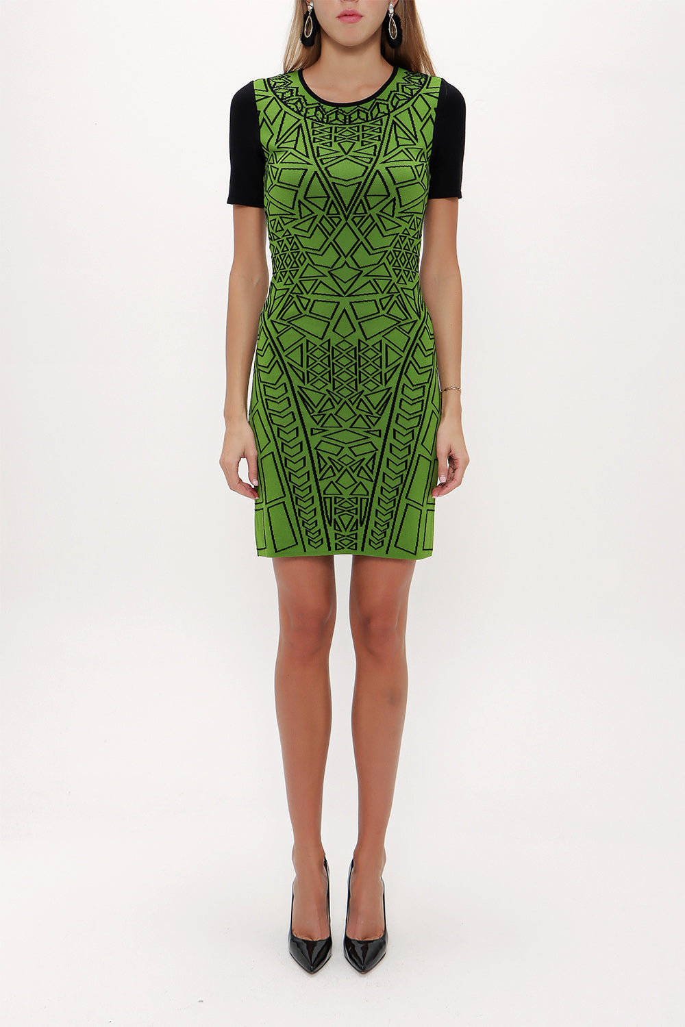 Black Green Printed and gem knit dress 28563