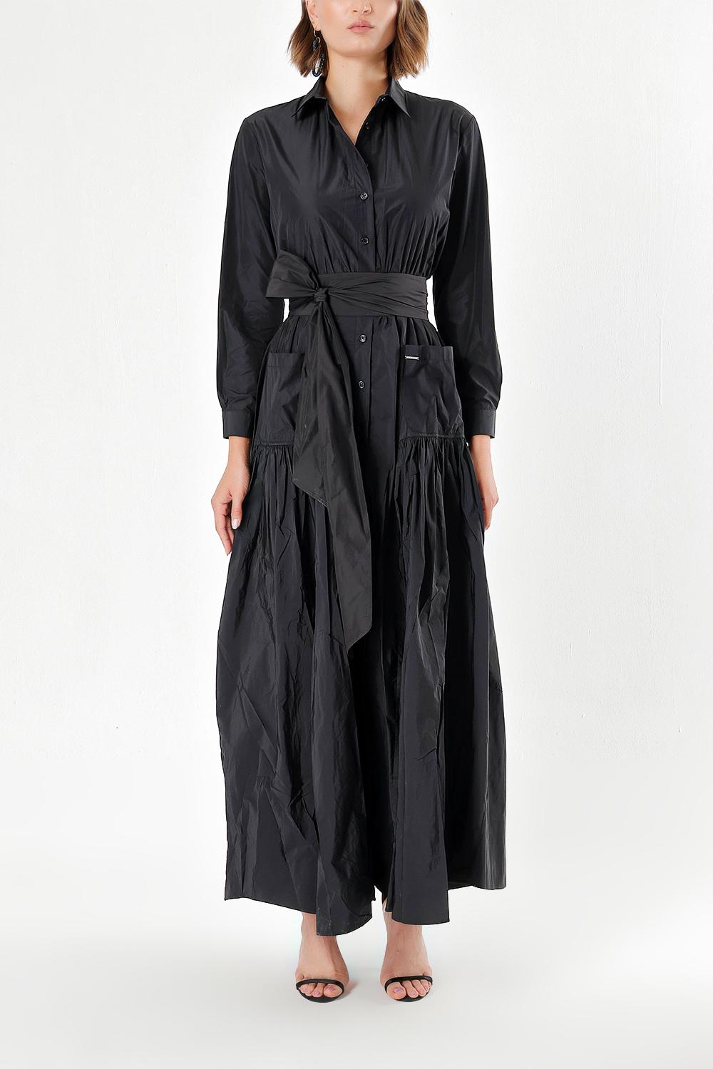 Black Pocket And Elastic Shirt Dress 92958