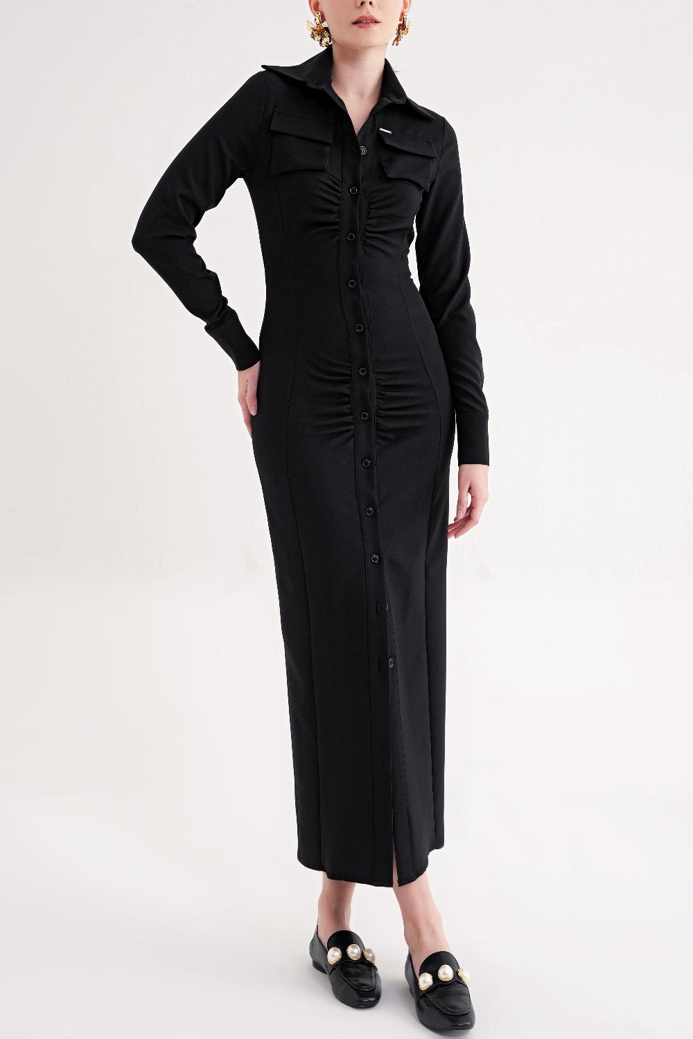 Black Slim fit pucker detailed long shirt dress 94664