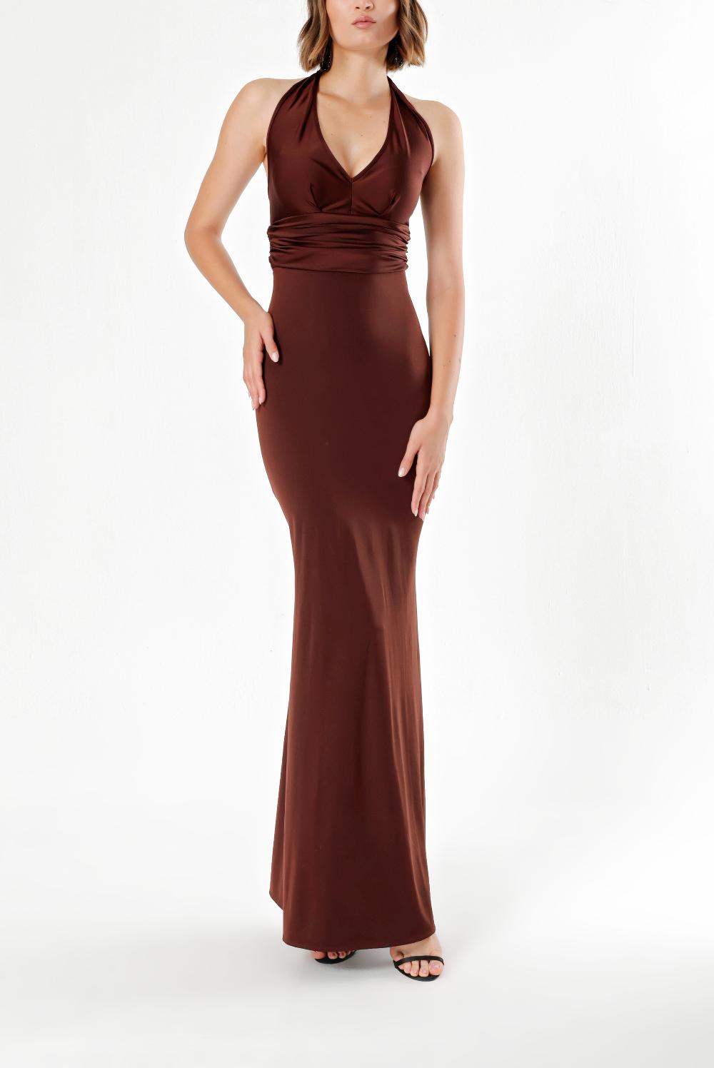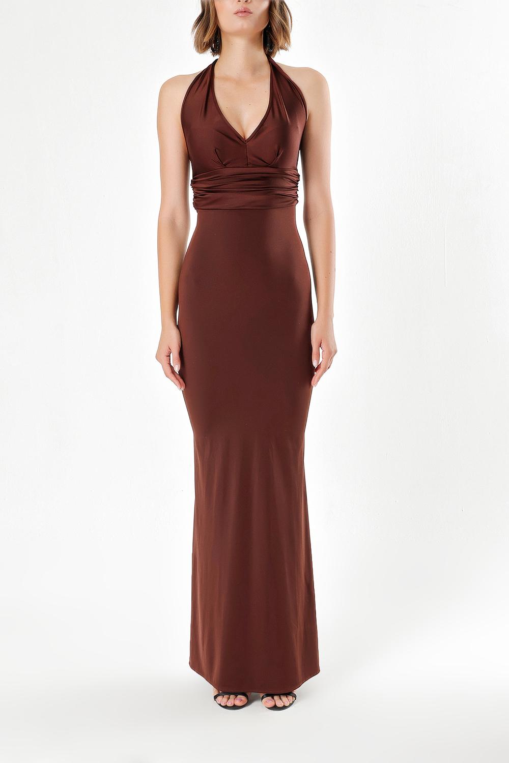 Brown DEEP V-NECK KNITTED FABRIC DRESS 91733