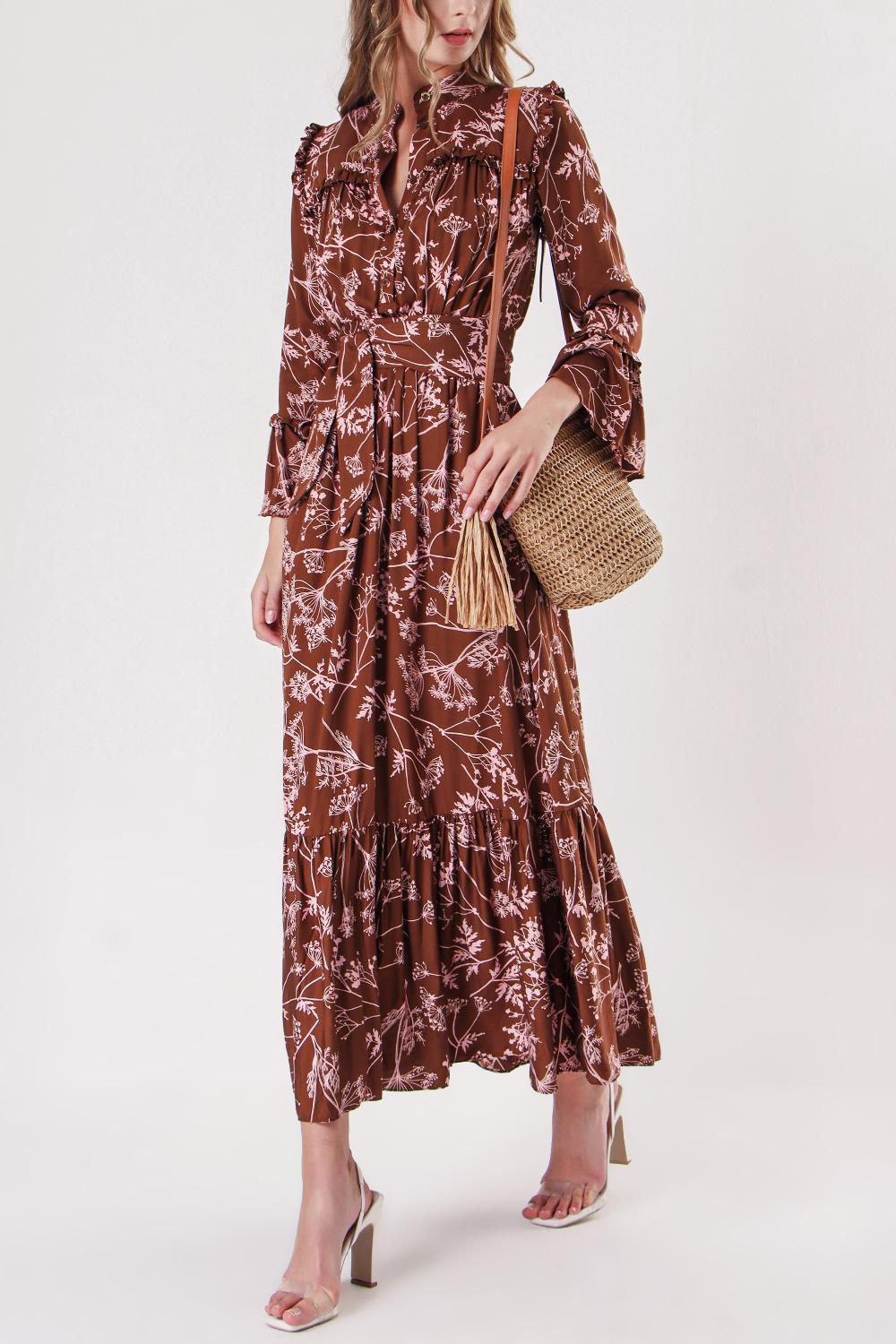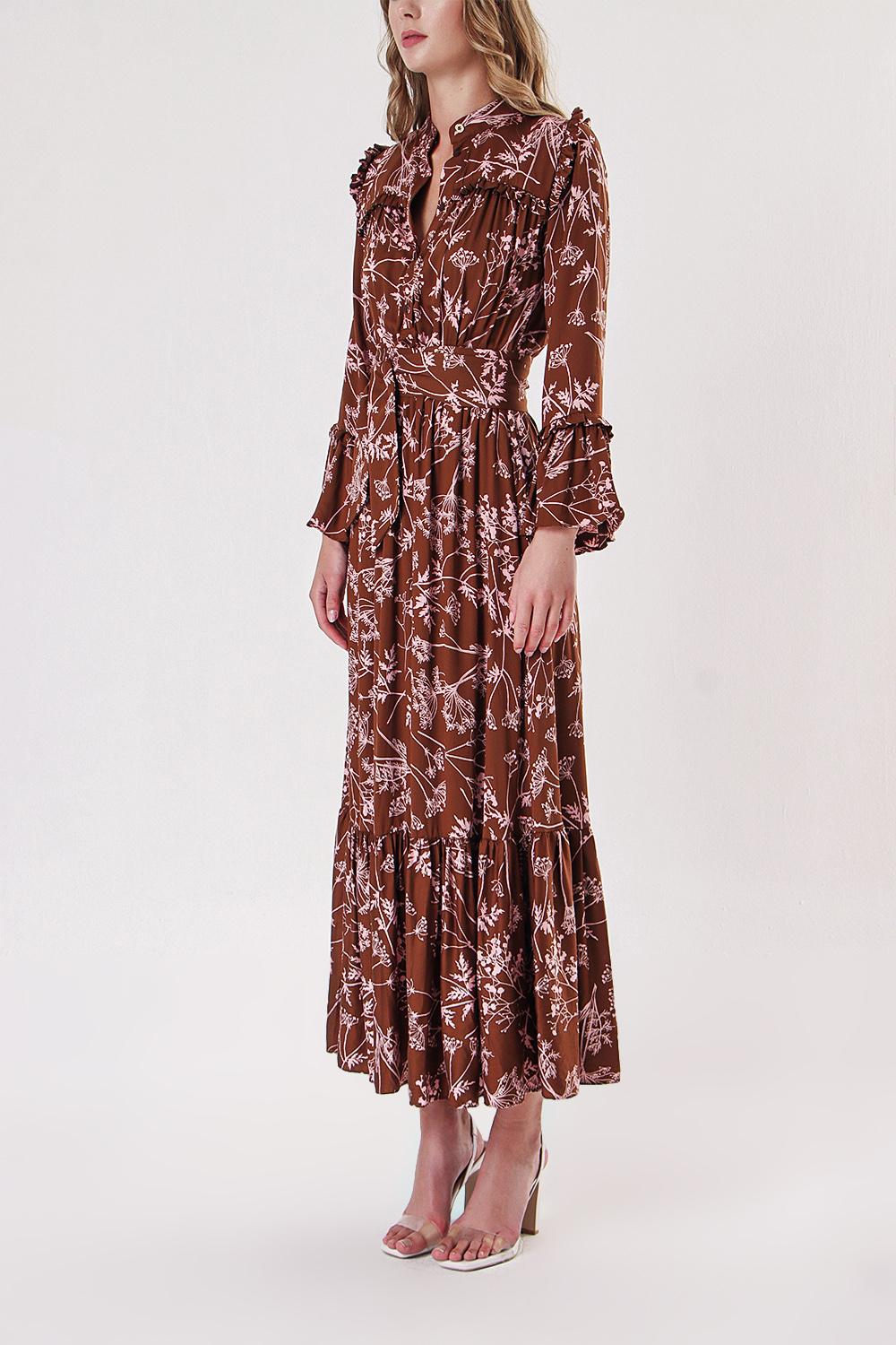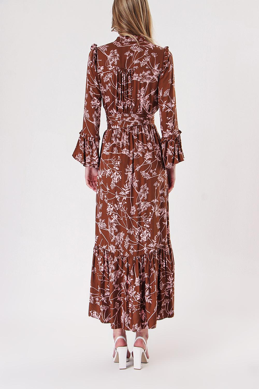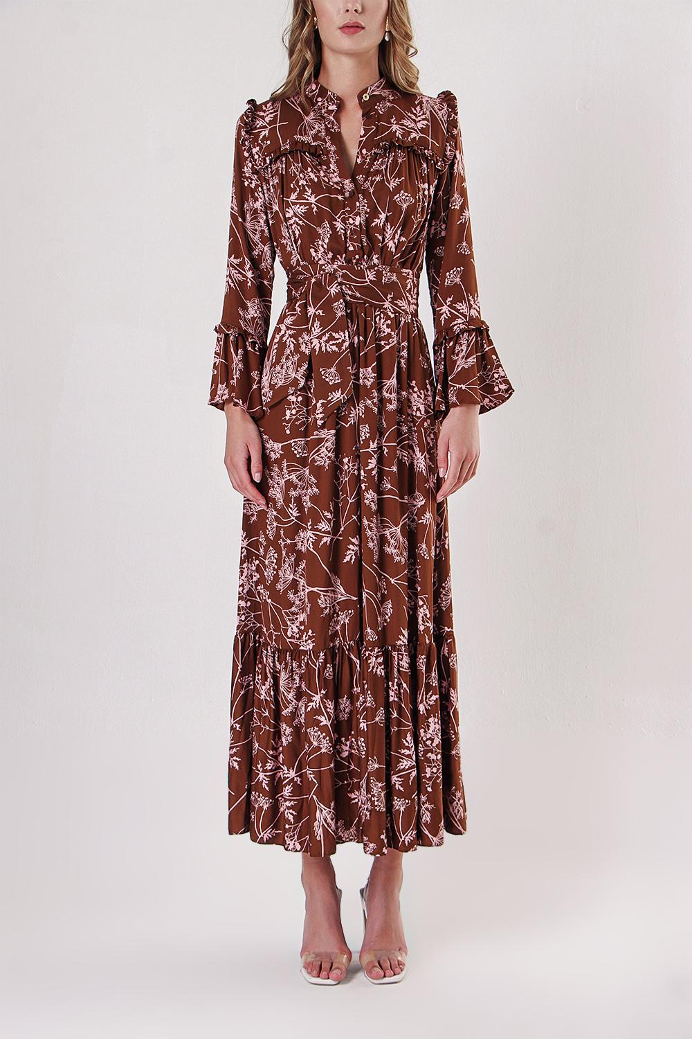Brown Long dress with elasticated gathers at the waist 94251