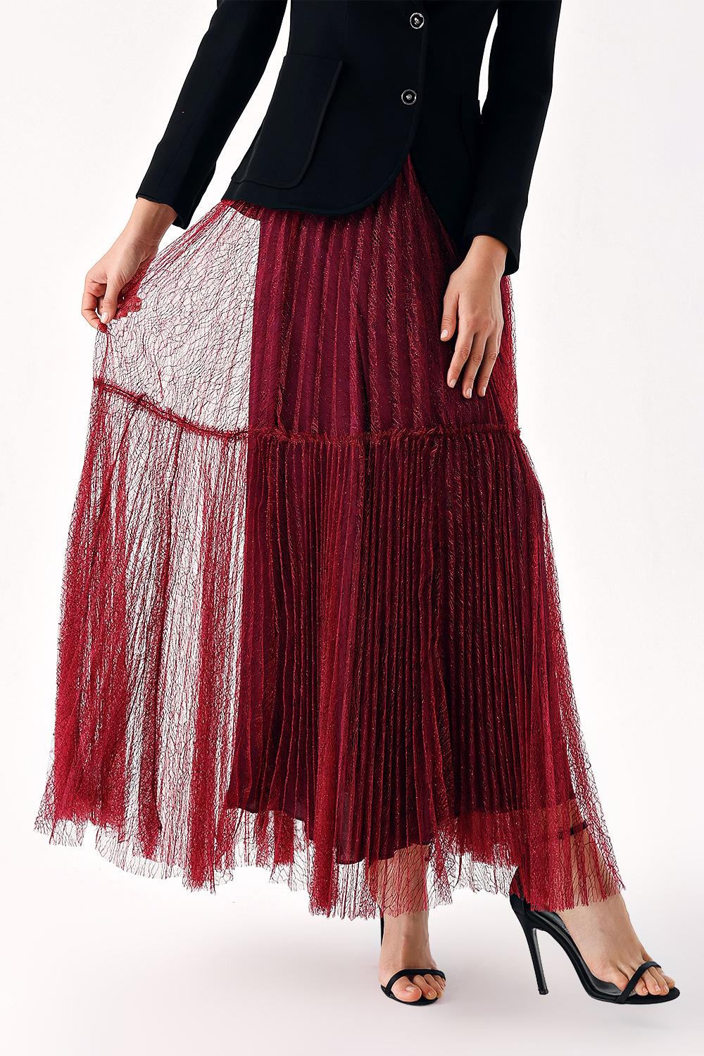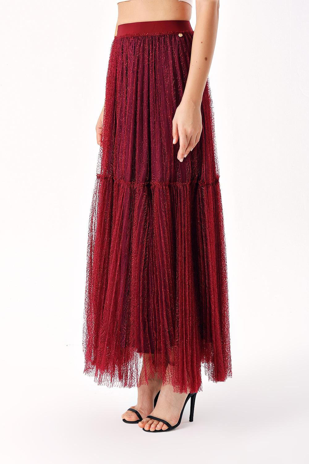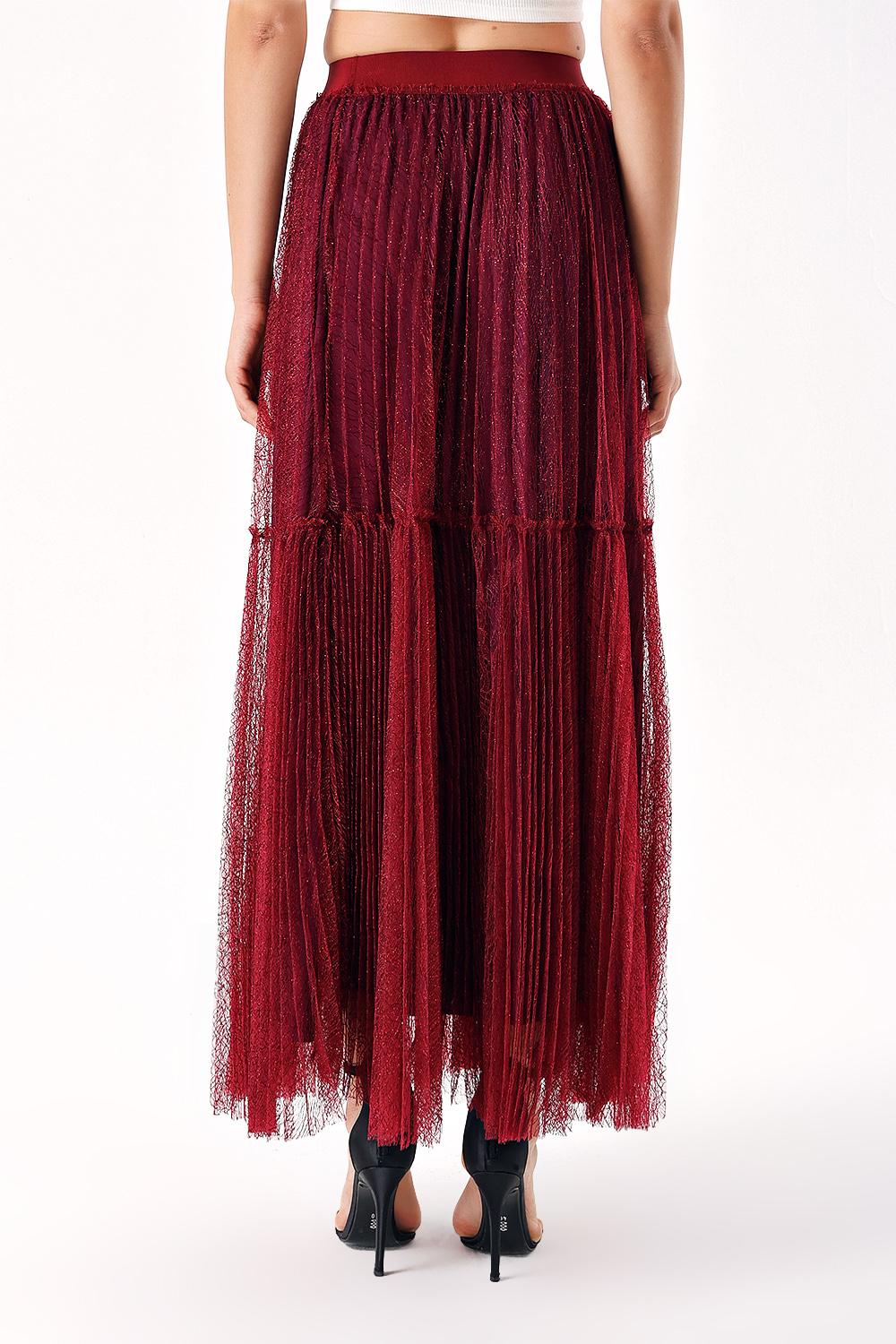 Burgundy Elastic waist pleated long tulle skirt 81235