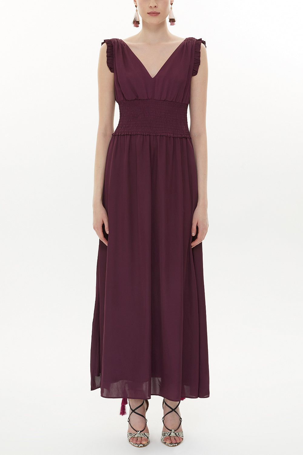 Burgundy Elastic waist V neck sleeveless maxi dress 93348