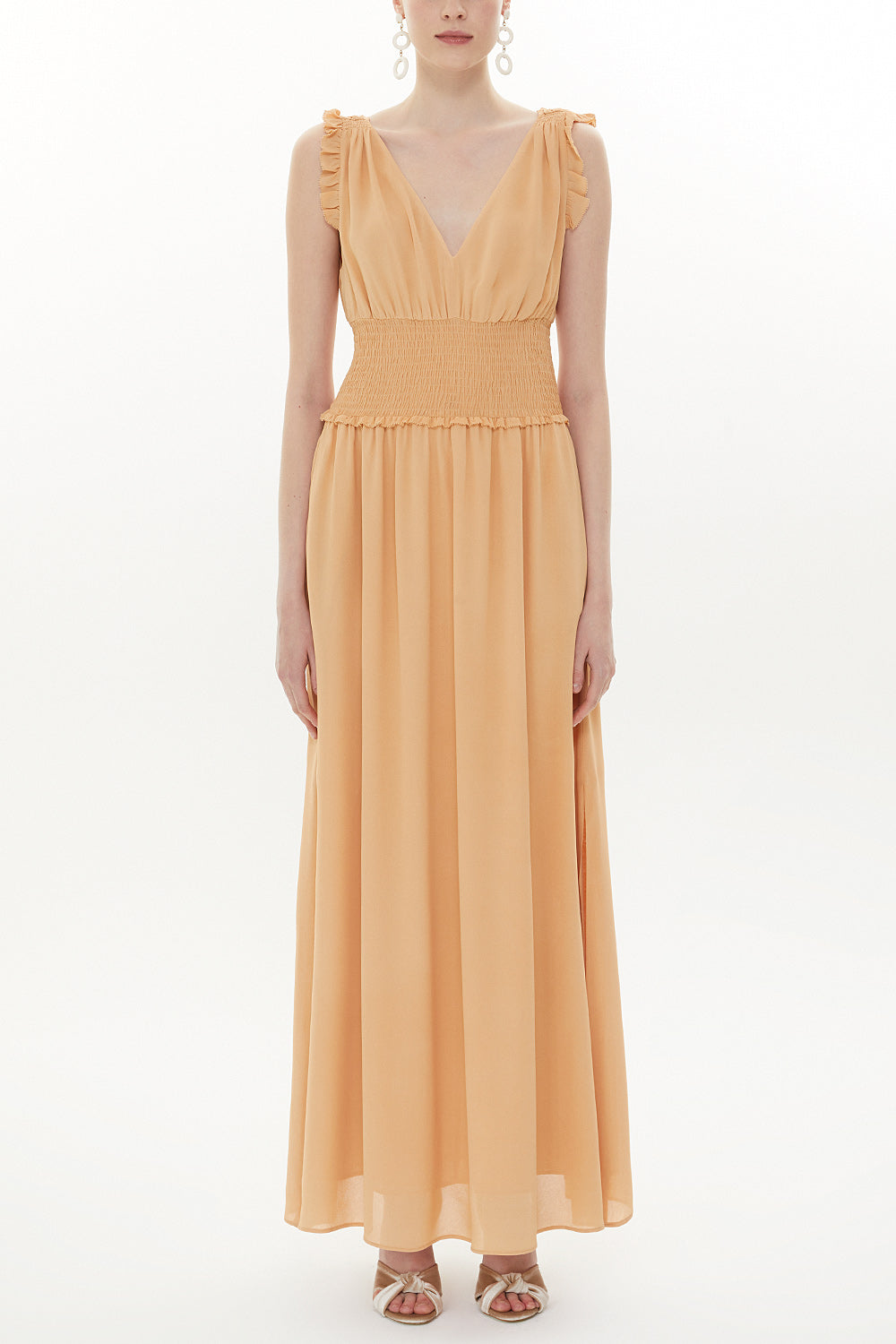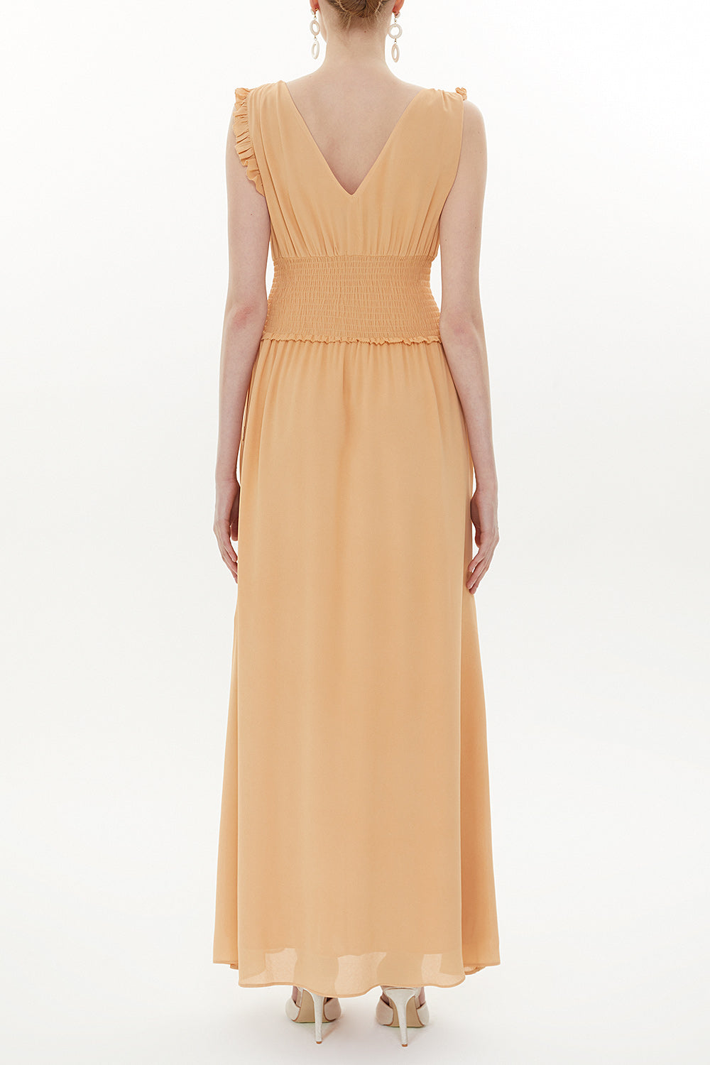 Camel Hair Elastic waist V neck sleeveless maxi dress 93348