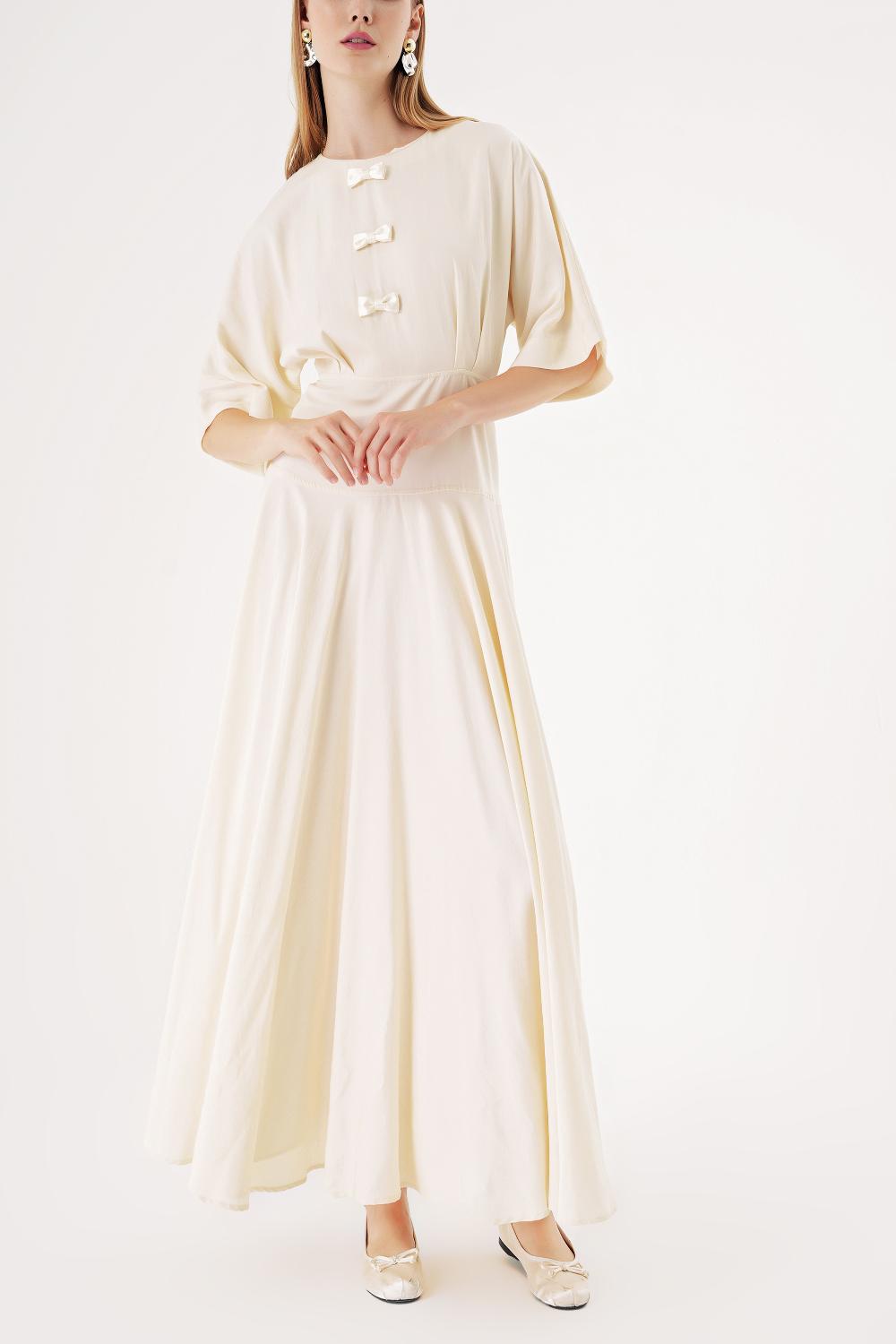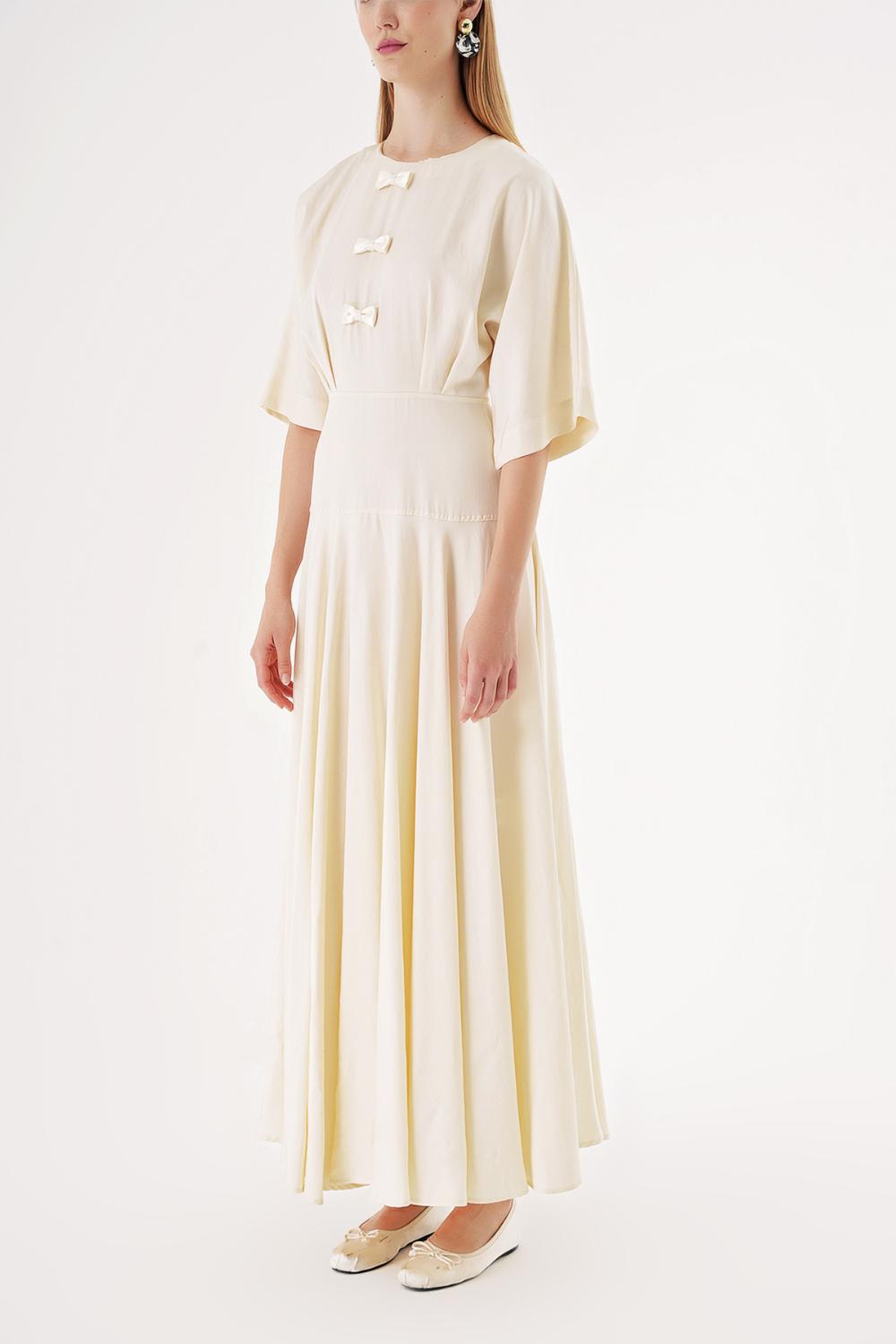 Ecru Flared sleeve ribbon-detailed ruffled dress 94538