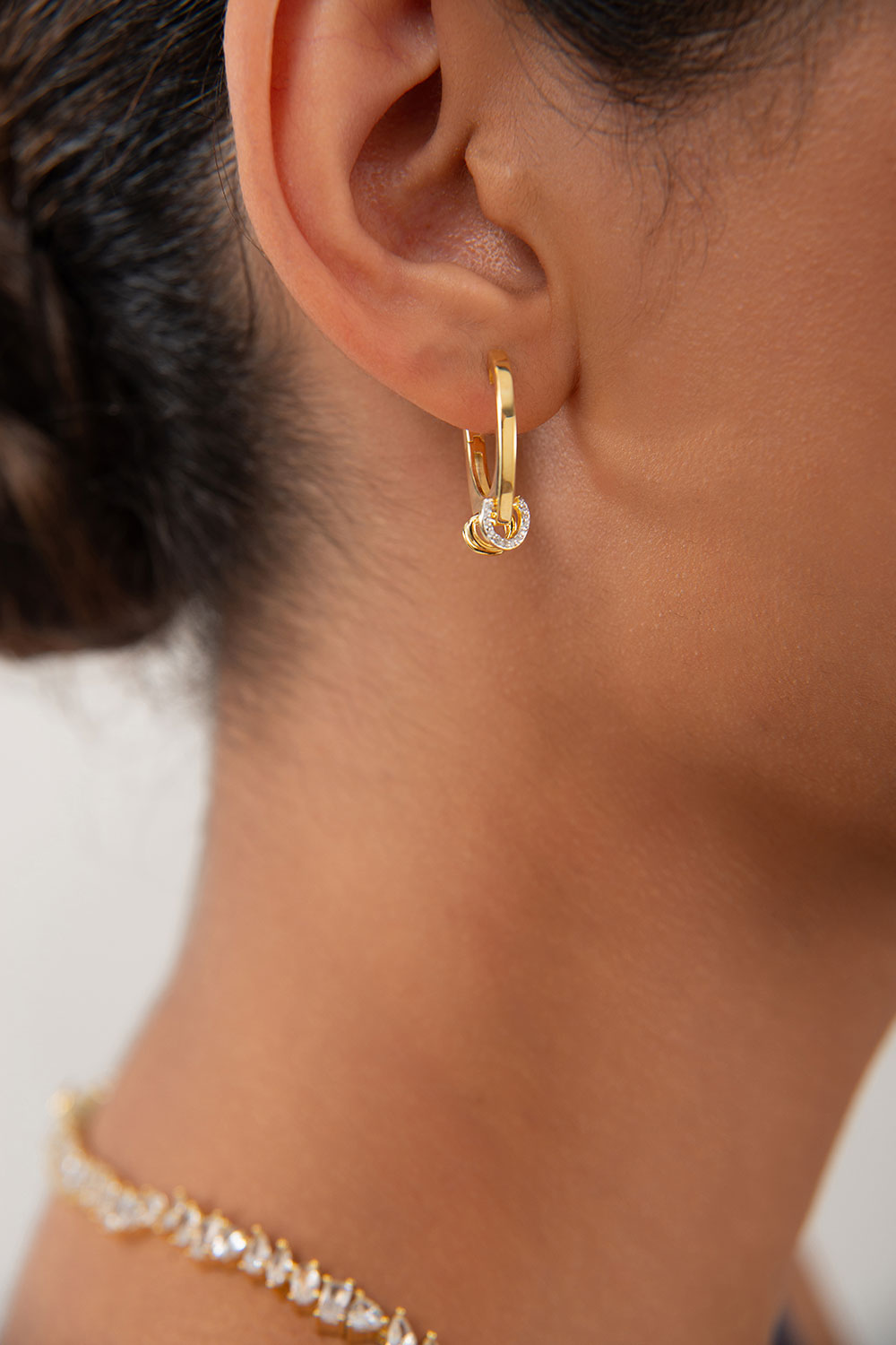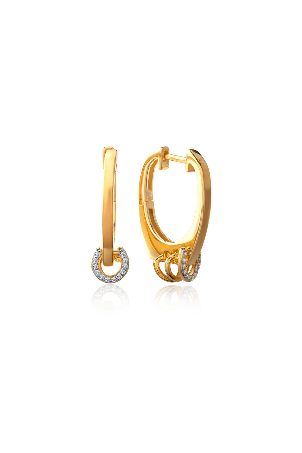 Gold 925 sterling silver earring with an elegant hoop shape and crystal stone detail at the tip 128