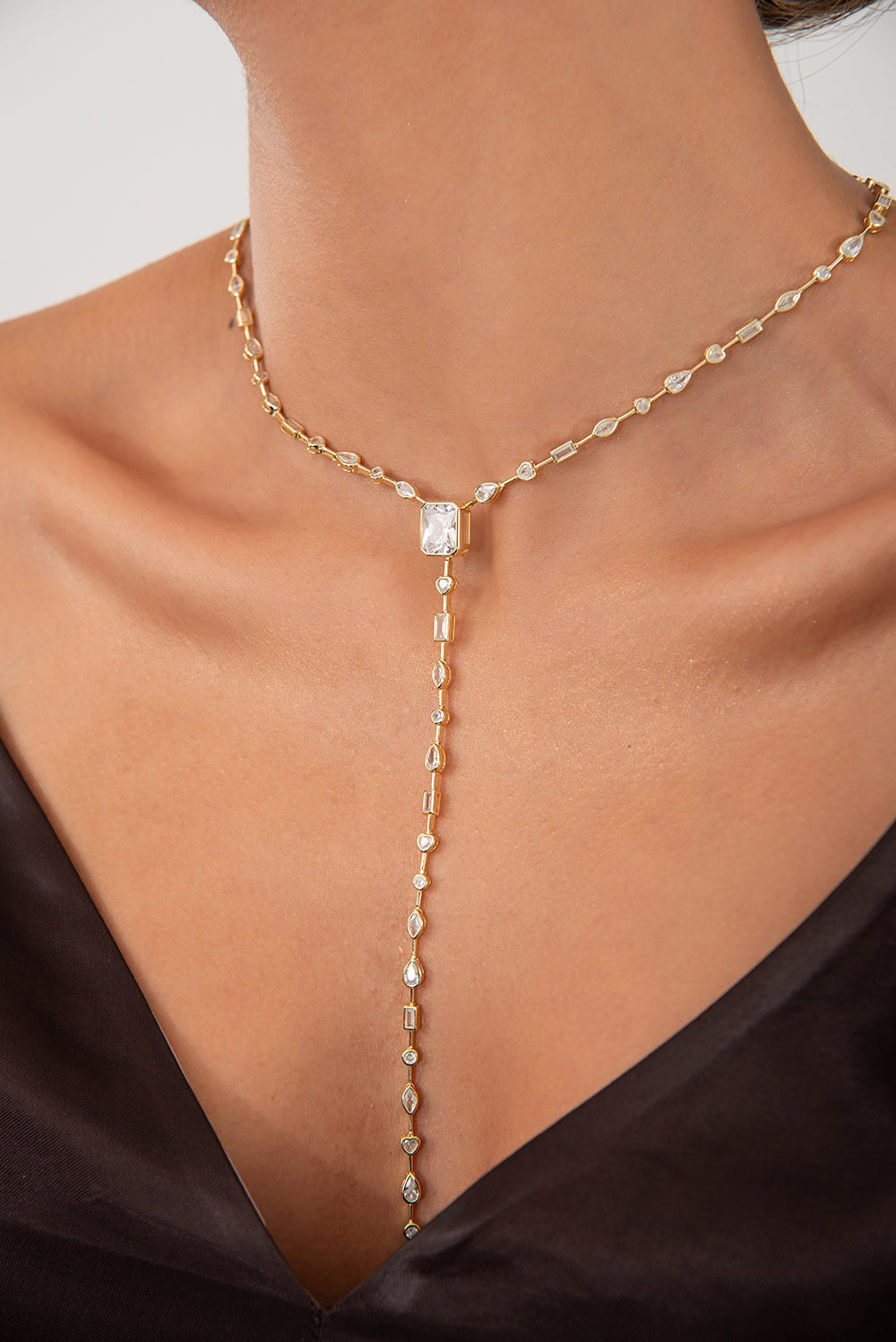 Gold Long Y-shaped 925 sterling silver necklace with crystal stone detail 168