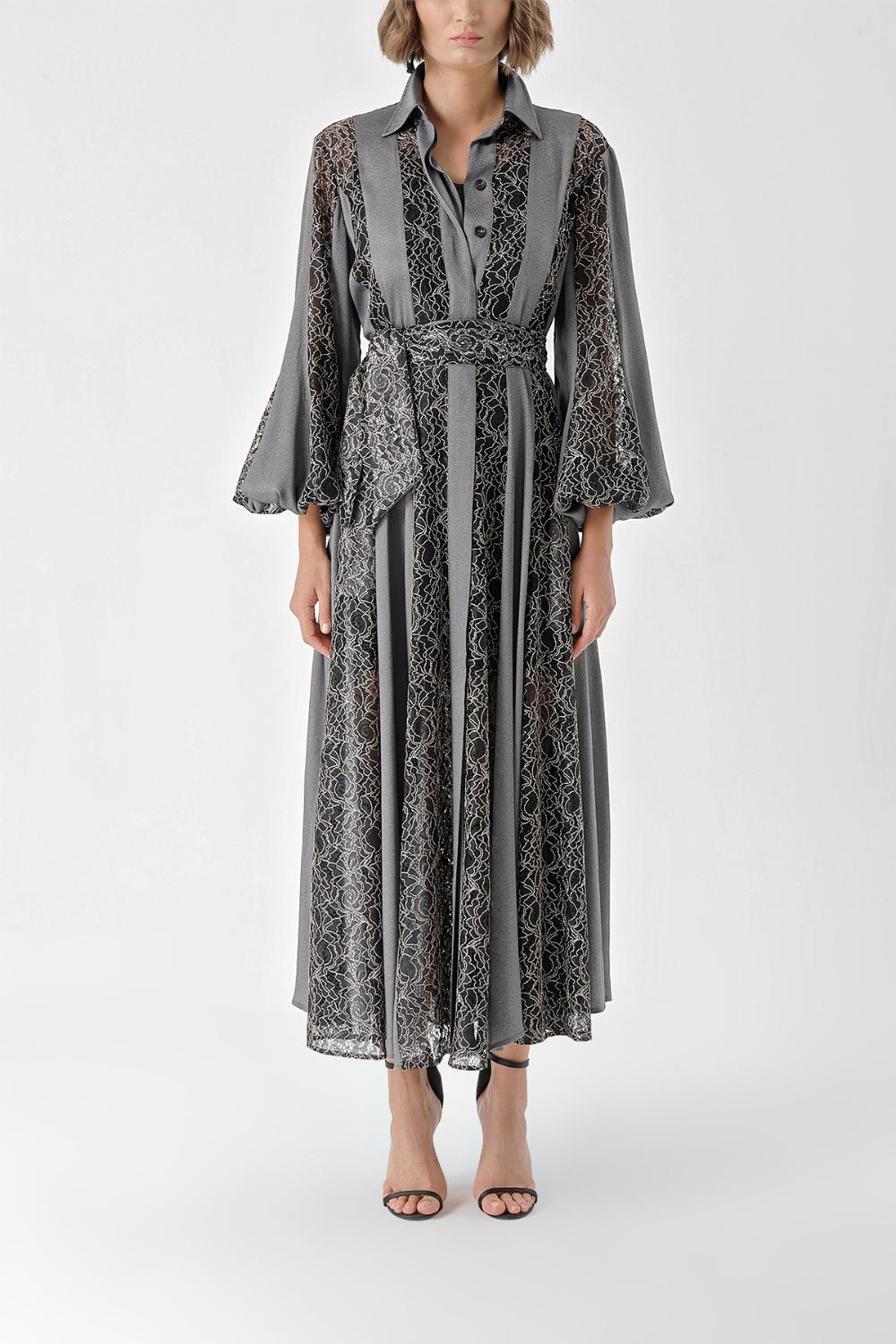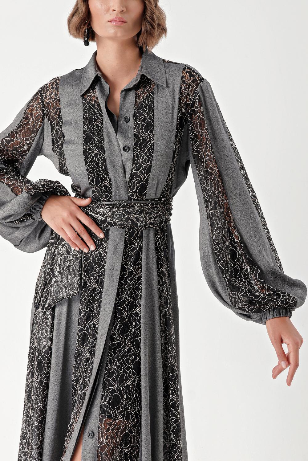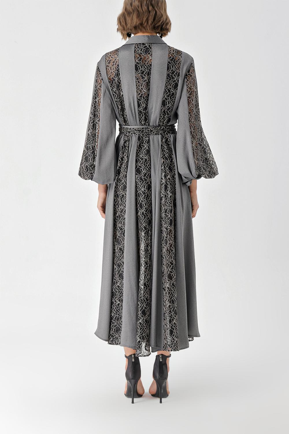 Gray Black Lace detailed long shirt dress 94342