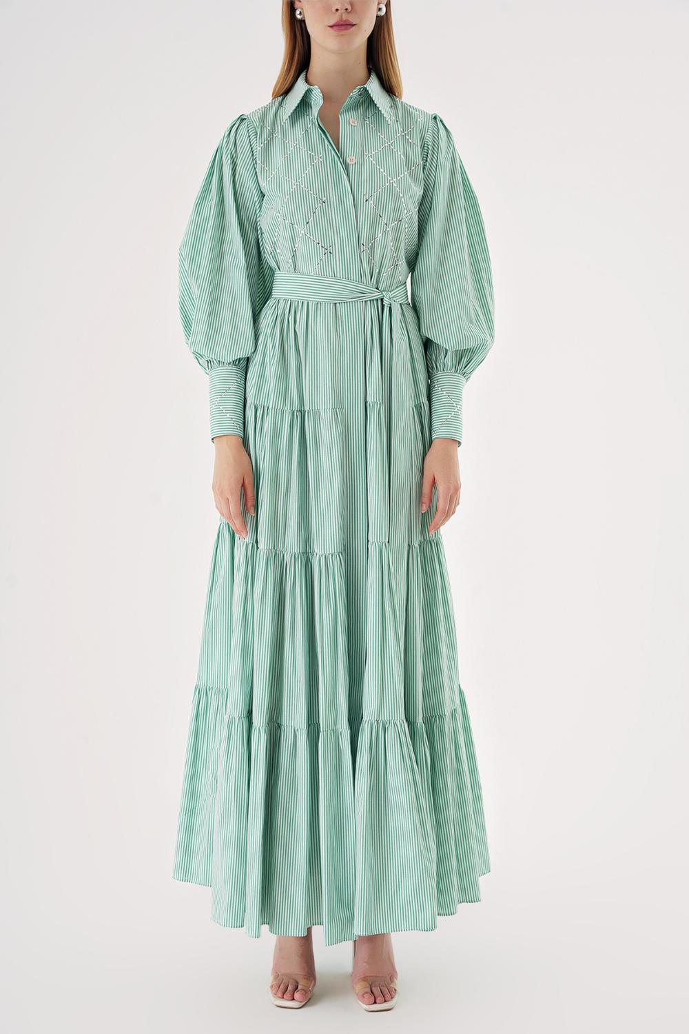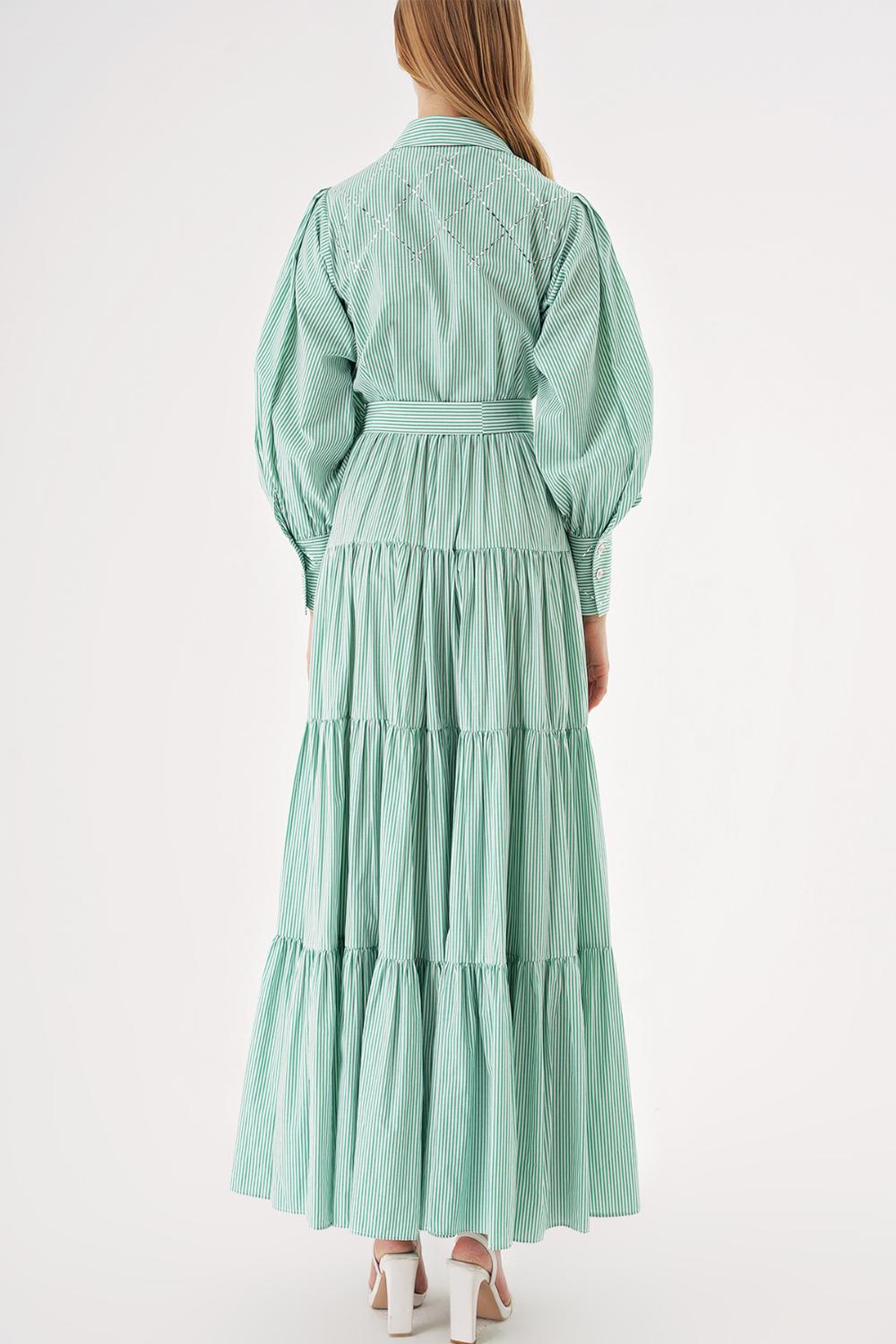 Green Balloon sleeve ruffled crystal stone embellished shirt dress 94546