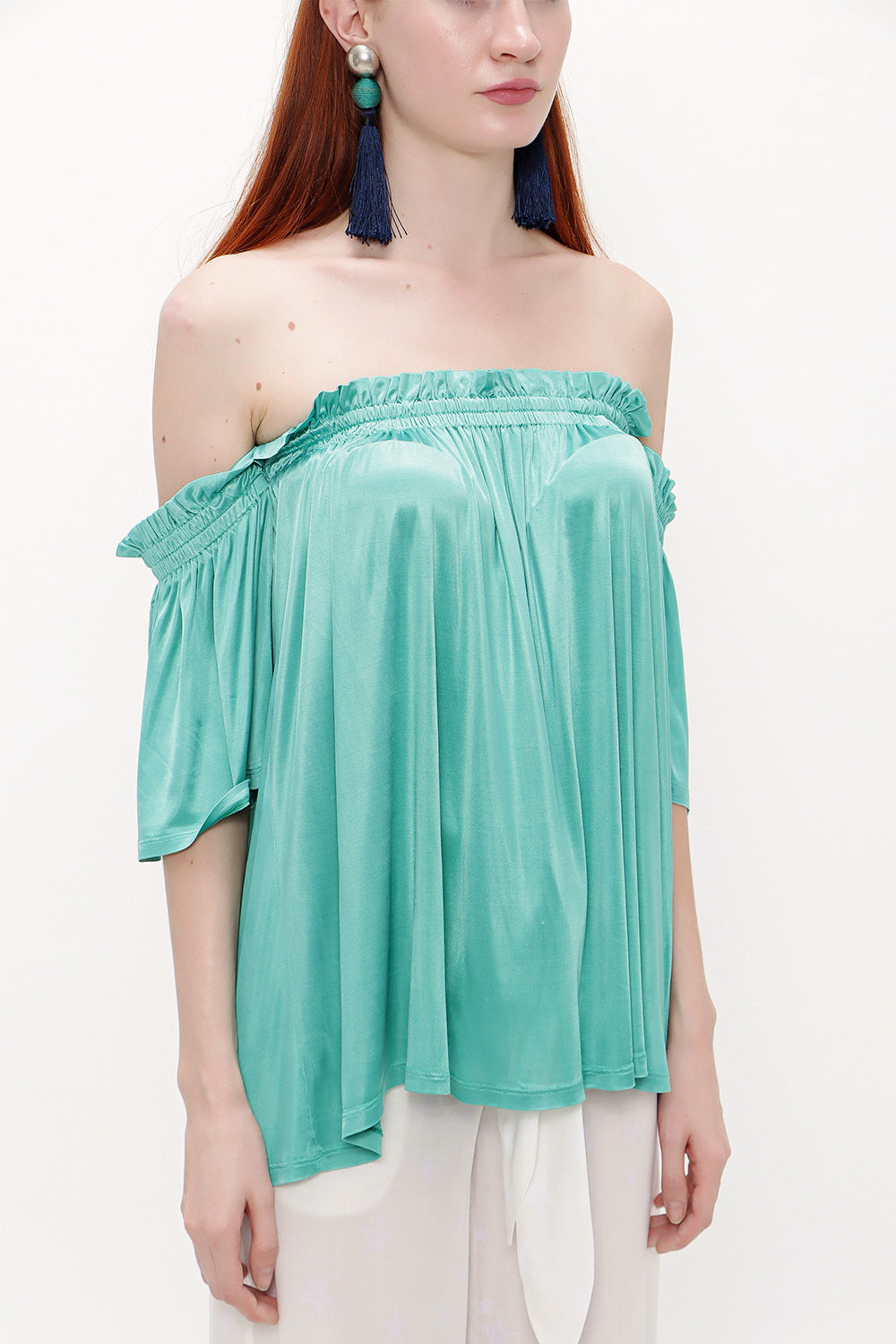 Green Elastic off shoulder woven blouse 19702