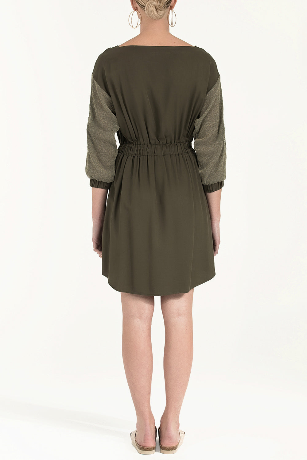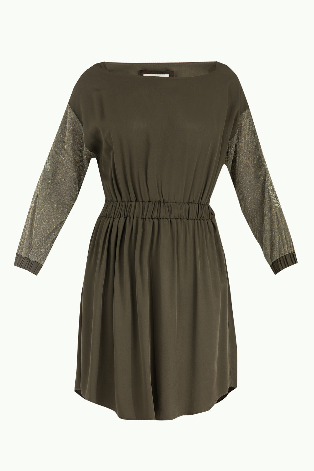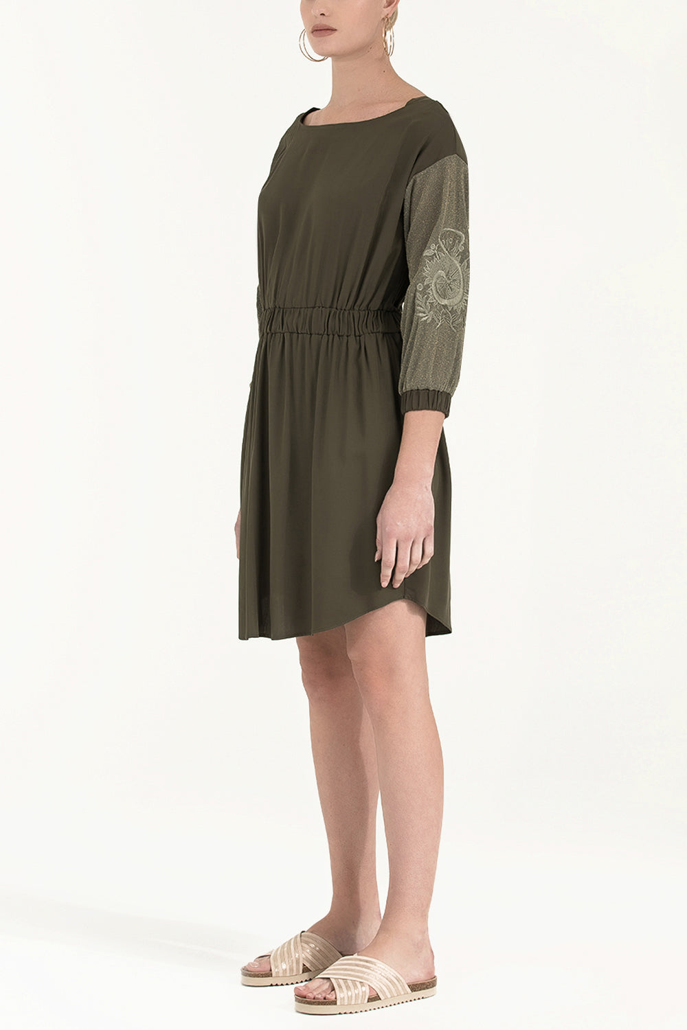 Khaki Embroidered elastic waist viscose mini dress 92096