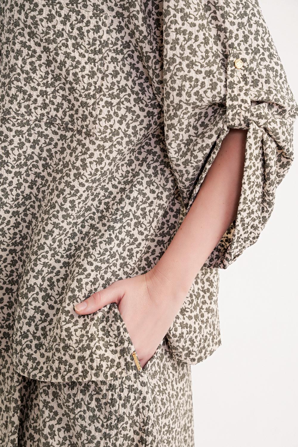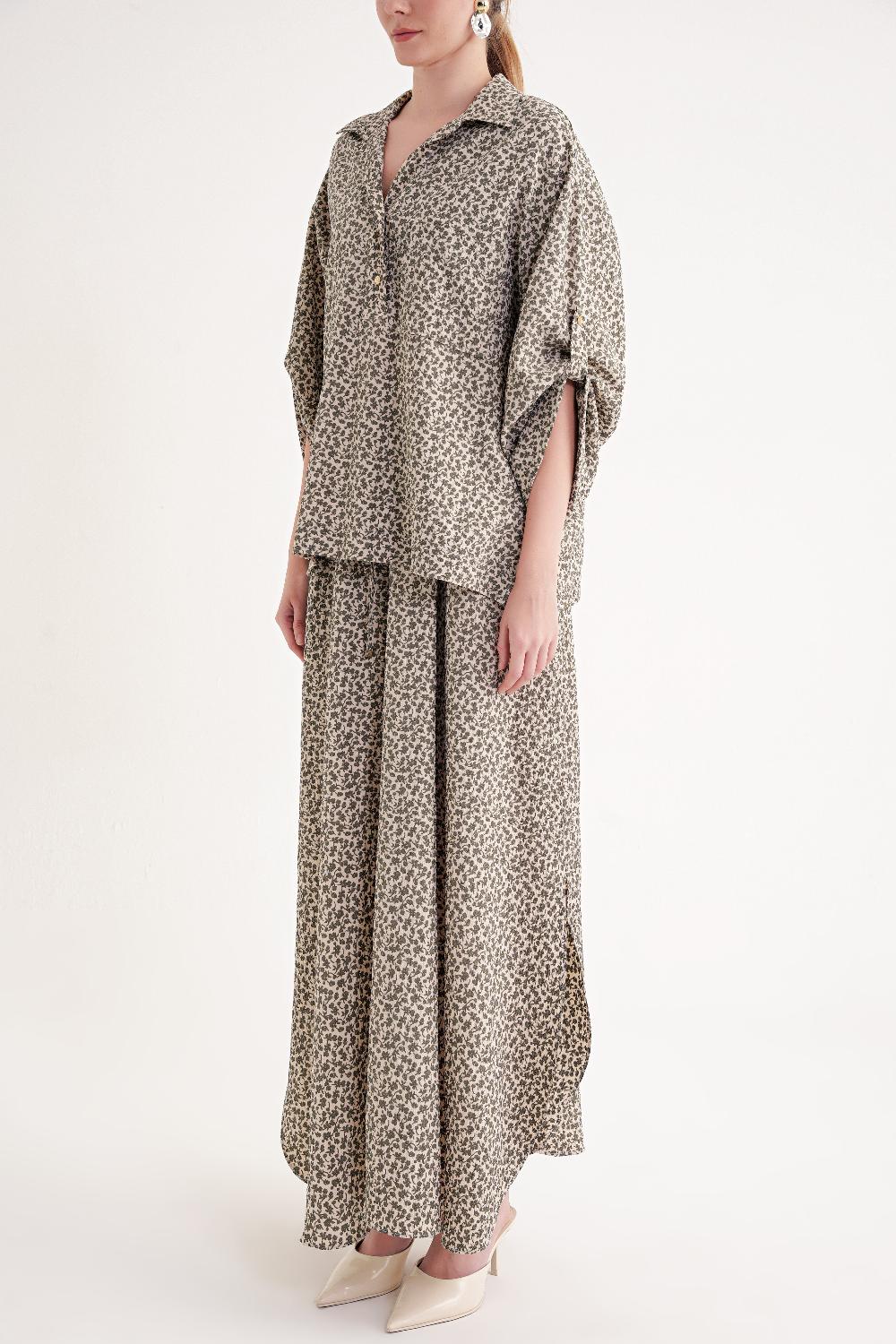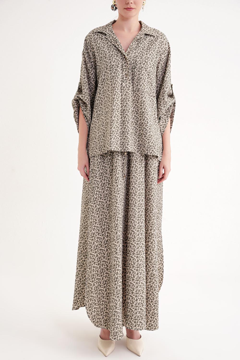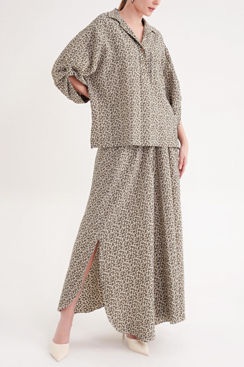 Khaki Loose-fit shirt and skirt suit with elastic waist 12358