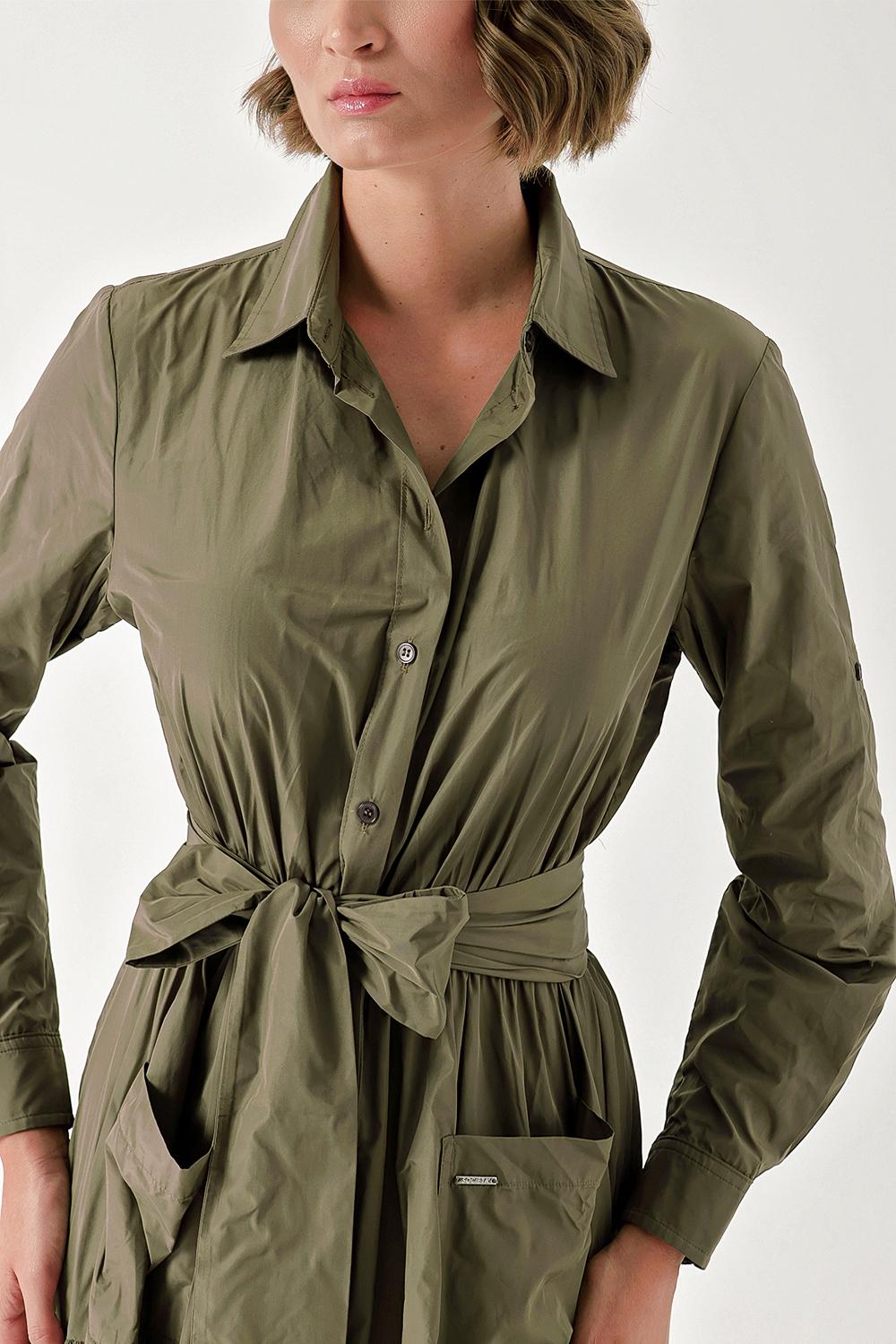 Haki Büzgülü uzun tafta gömlek elbise 94354