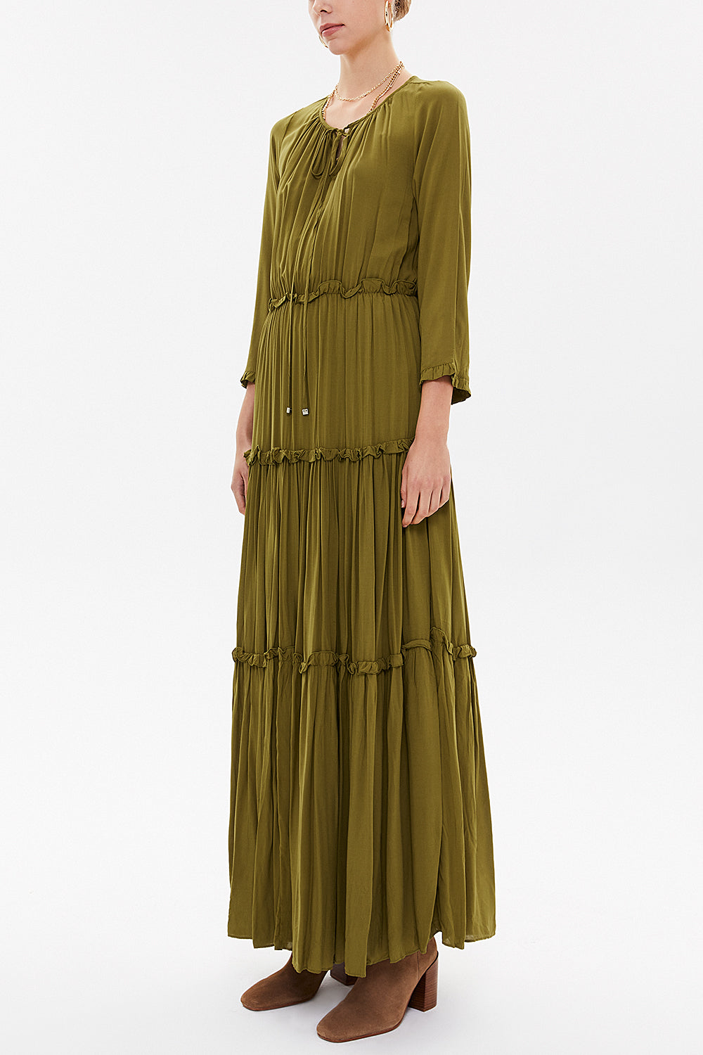 Khaki Tie-neck ruffled maxi dress 93146