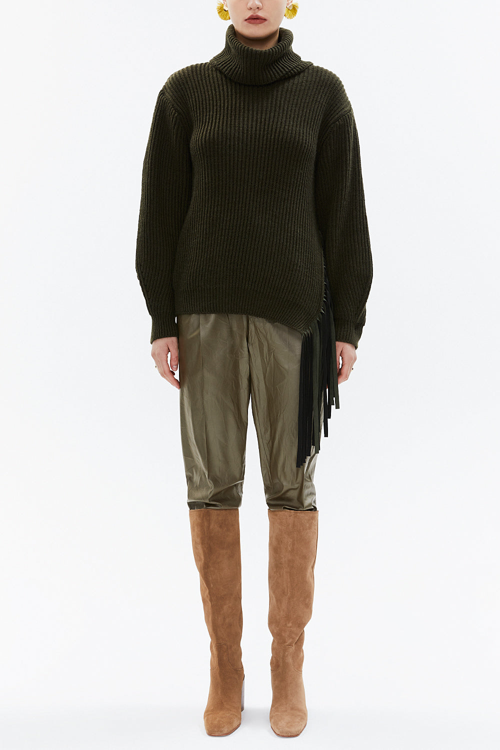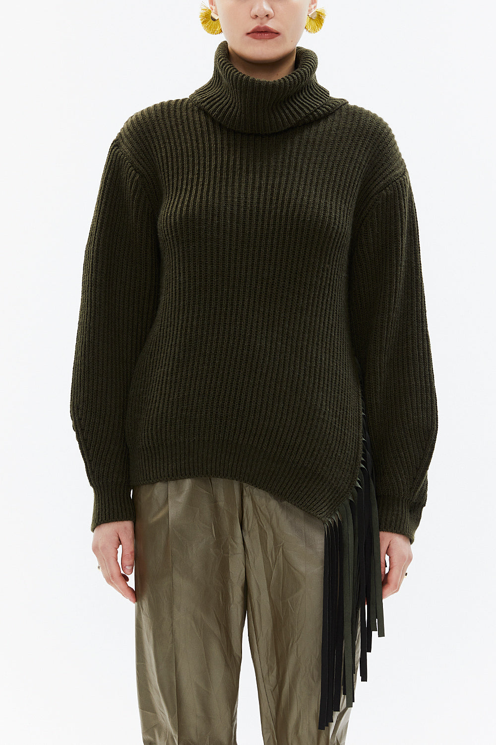 Khaki Turtleneck detail knit sweater with tassels 19816