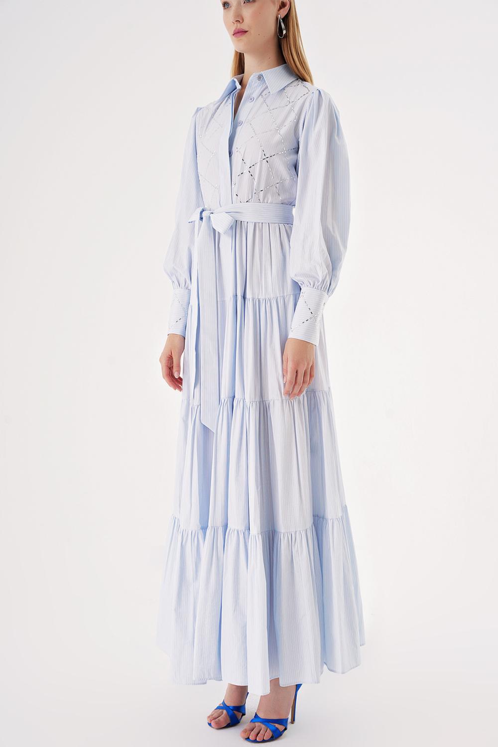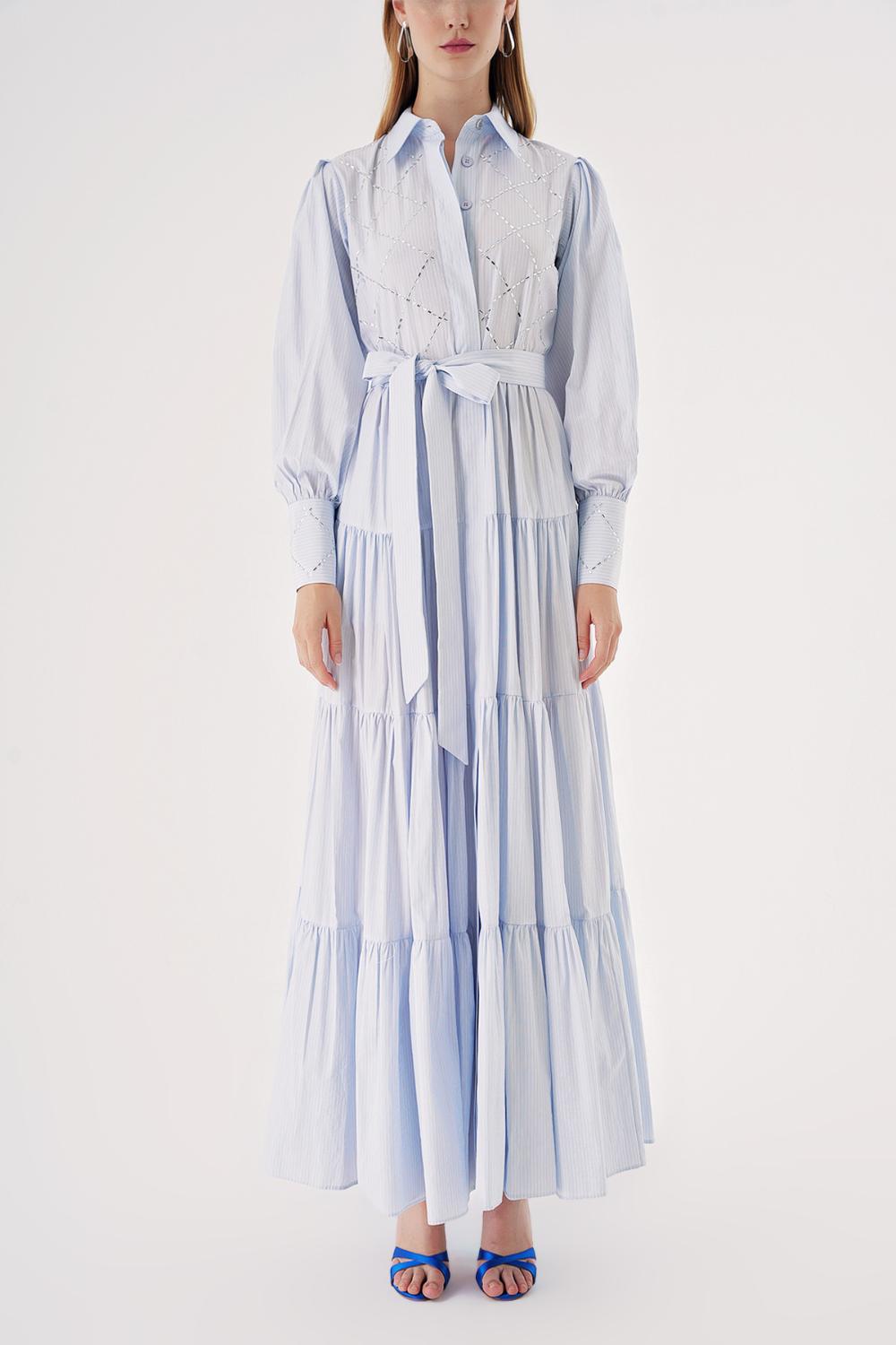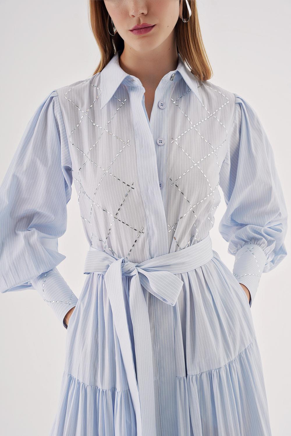Light Blue Balloon sleeve ruffled crystal stone embellished shirt dress 94546