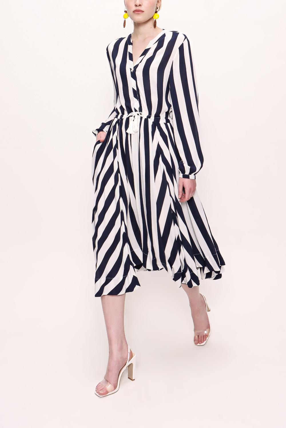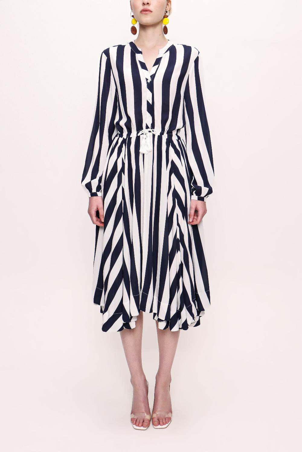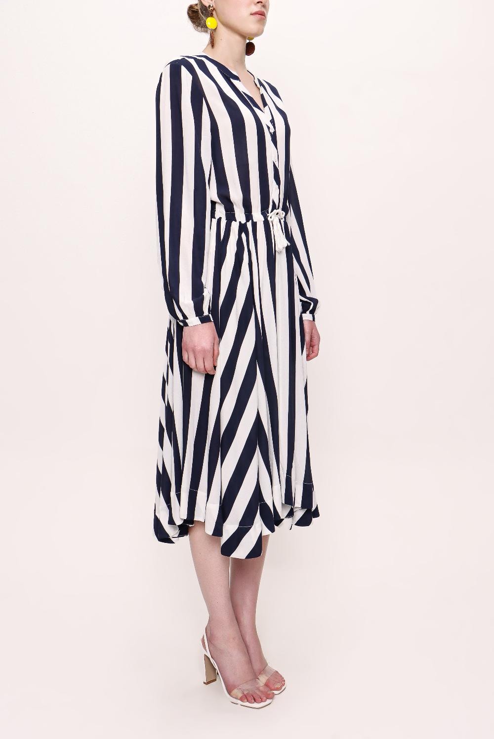 Navy Blue Asymmetric Cut Waist Belted Dress 92854
