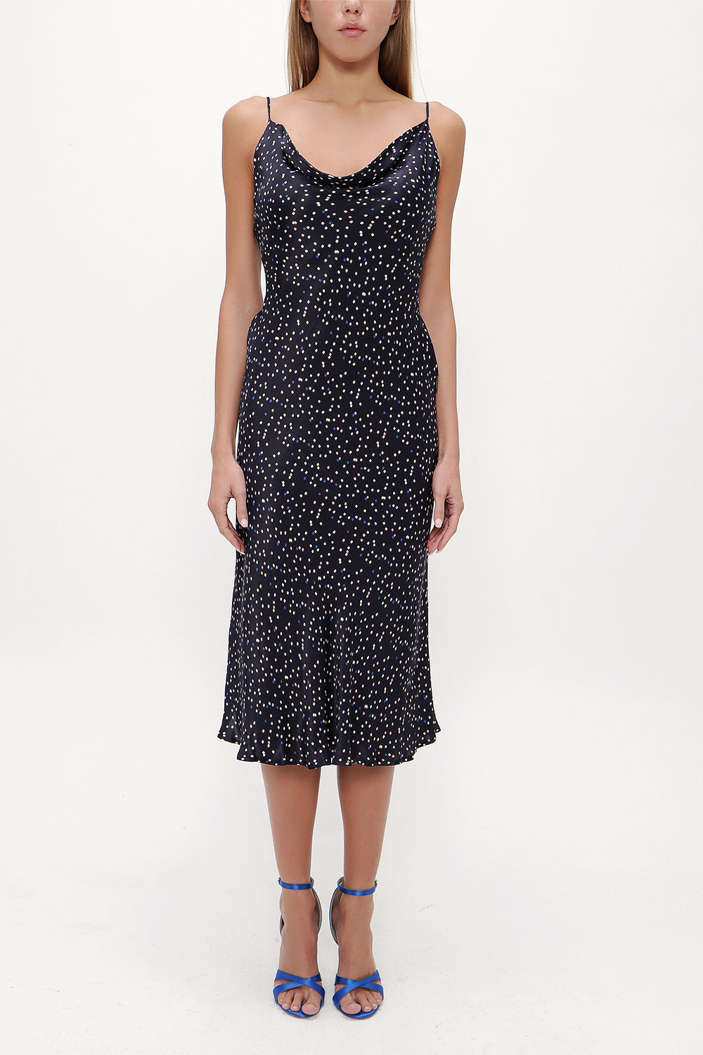 Navy Blue Degage collar spaghetti straps midi dress 92844