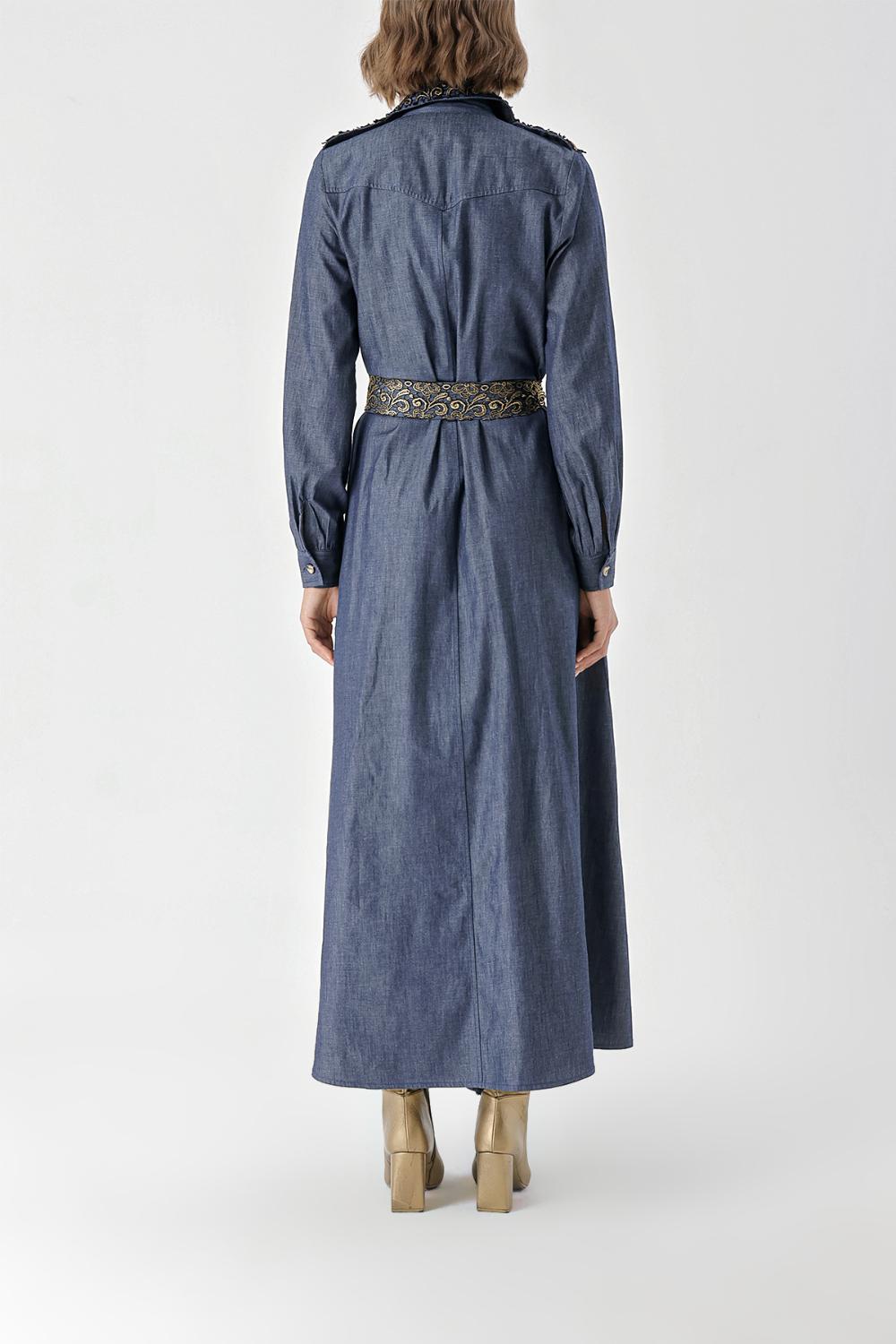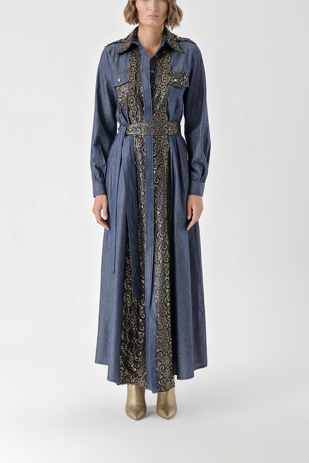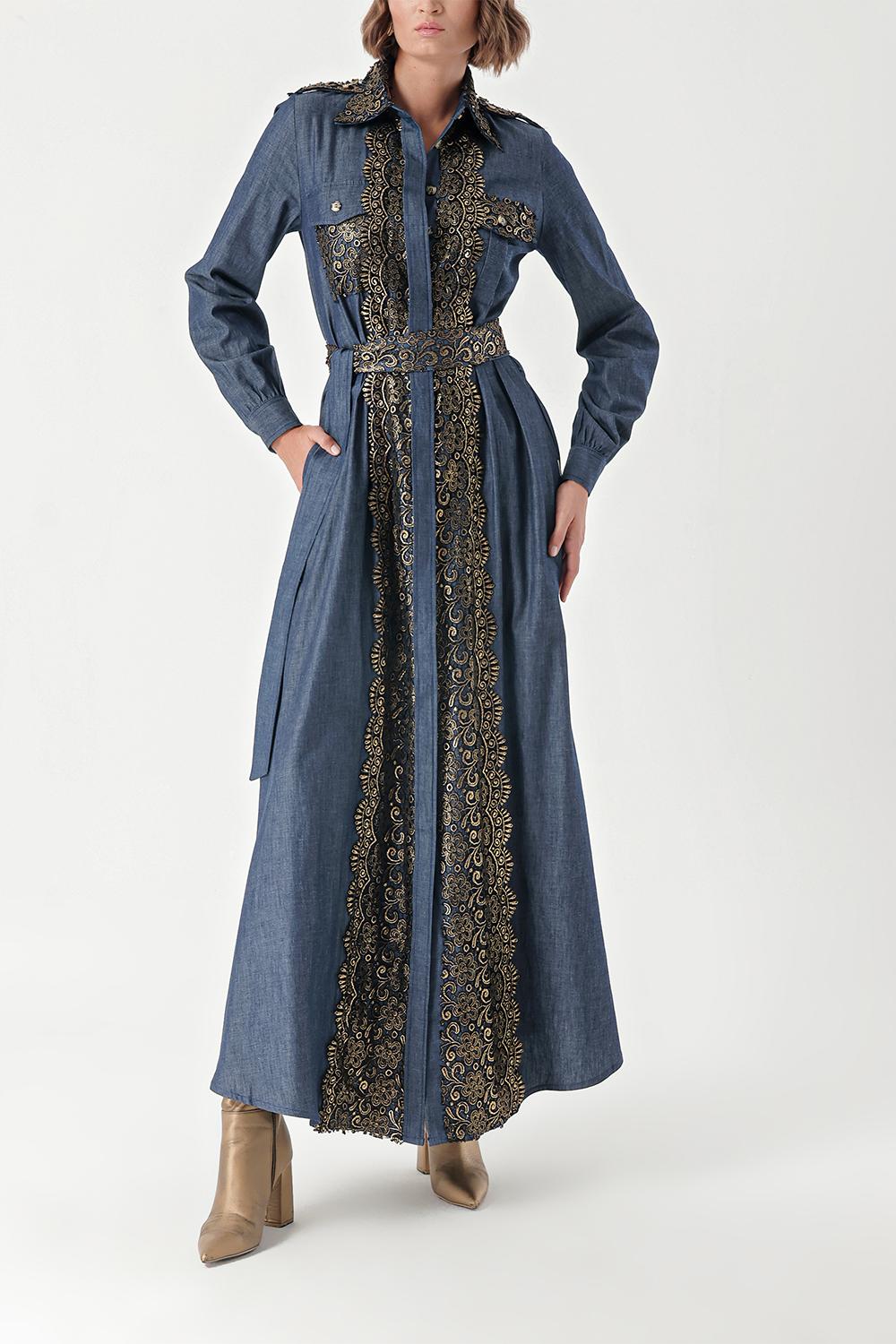 Navy Blue Gold Long denim dress with button and lace detail 94326