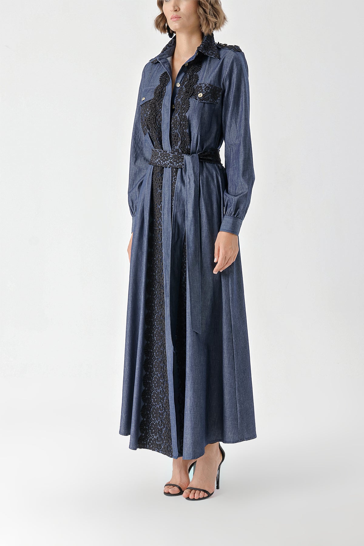 Navy Blue Long denim dress with button and lace detail 94376