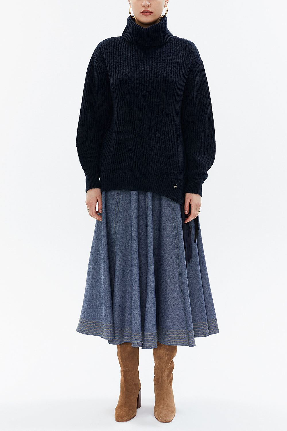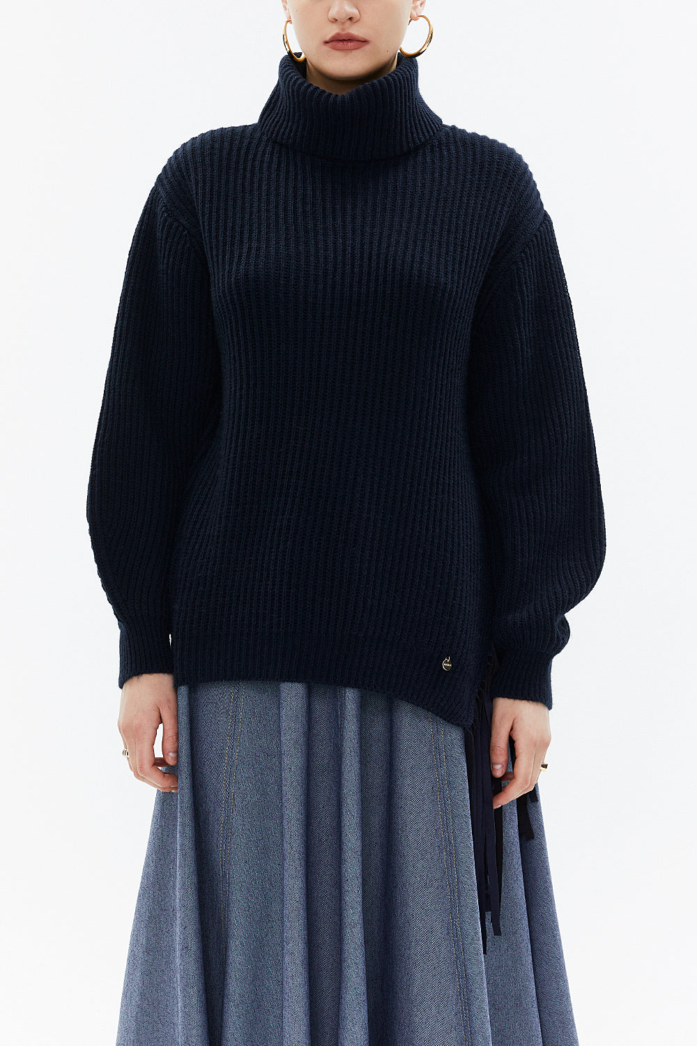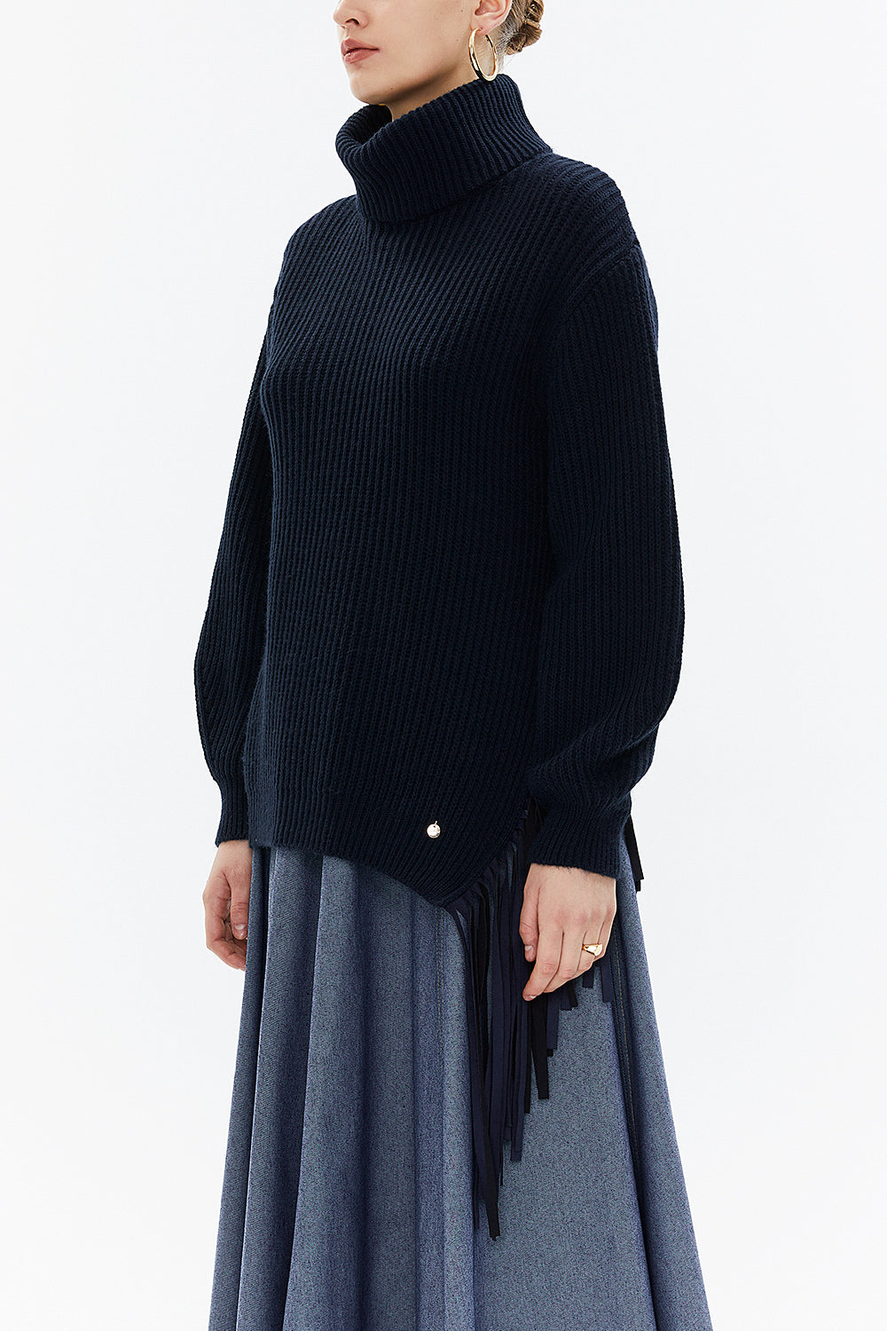 Navy Blue Turtleneck detail knit sweater with tassels 19816