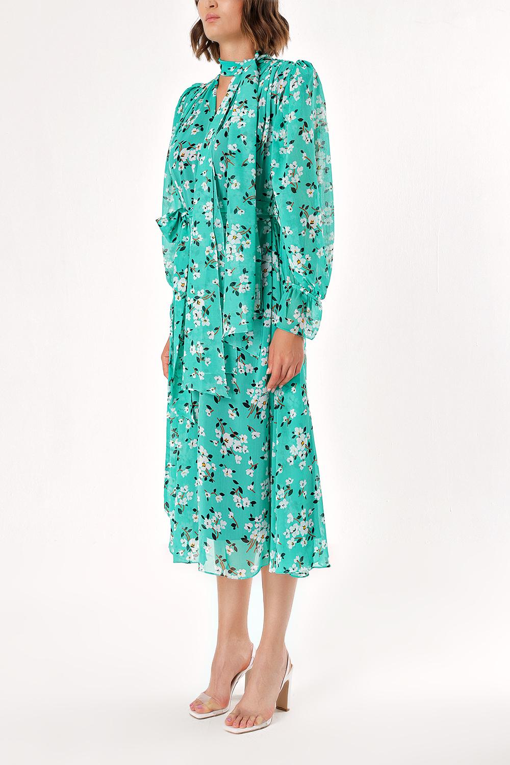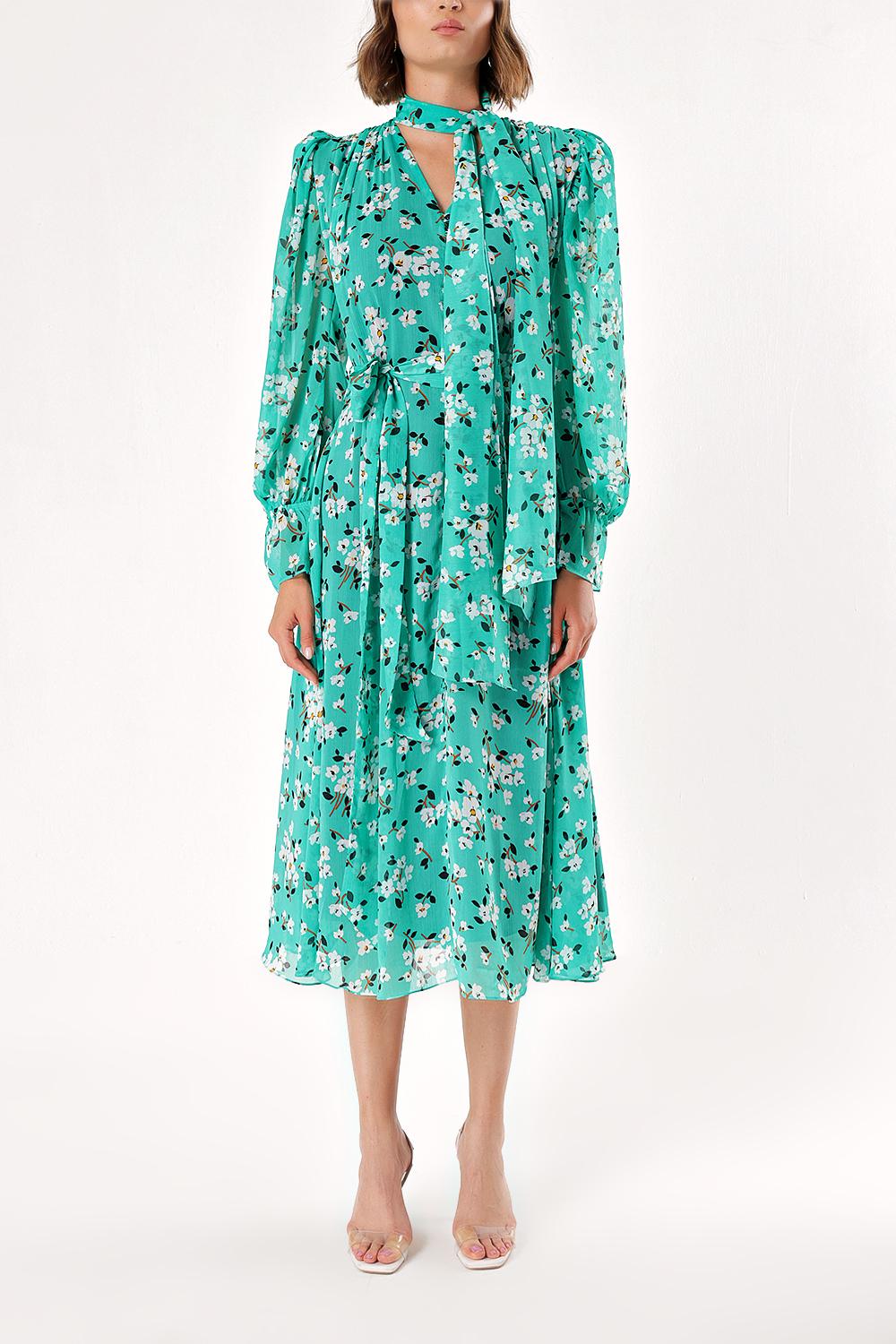 Patterned Lace-up neck wide cut shoulder padded dress 93734
