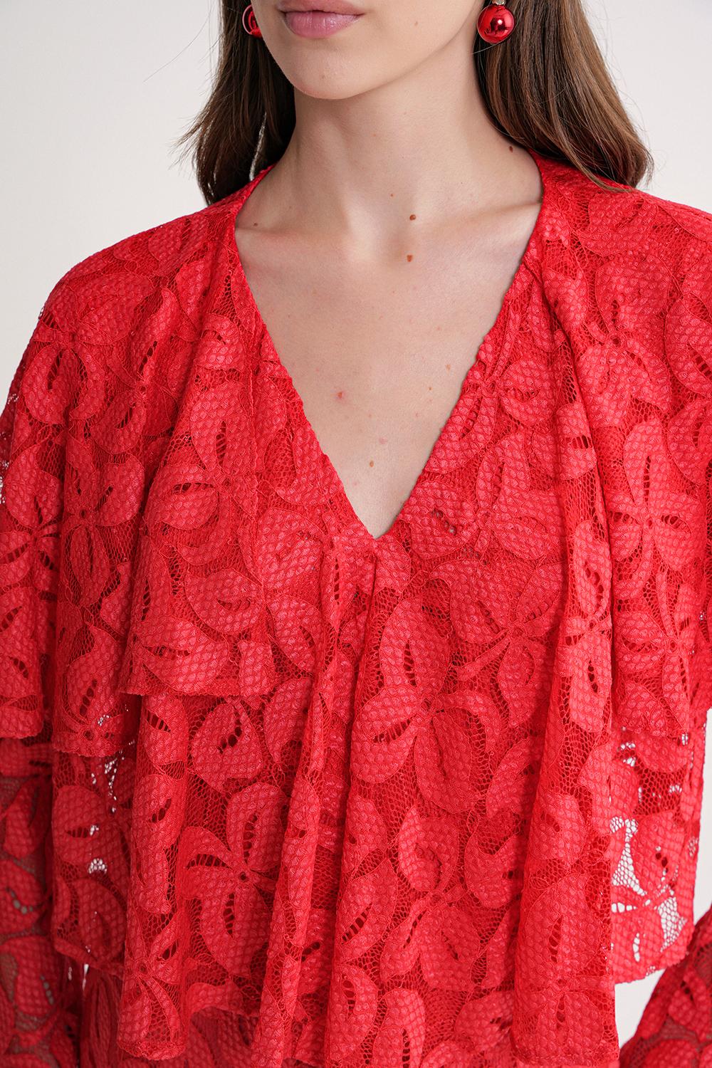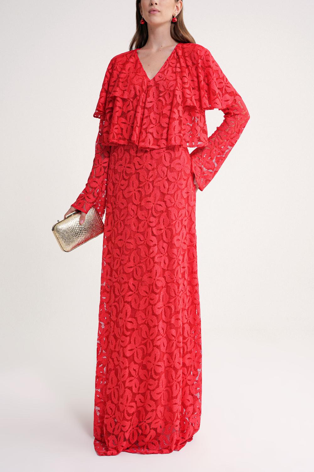 Red Long lace dress with ruffle detail on the neckline 94637