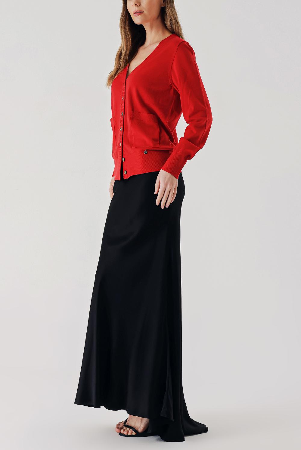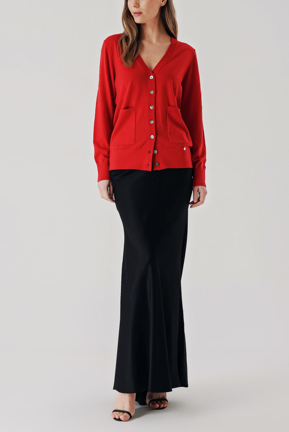 Red V-neck woolen long knit cardigan 28867